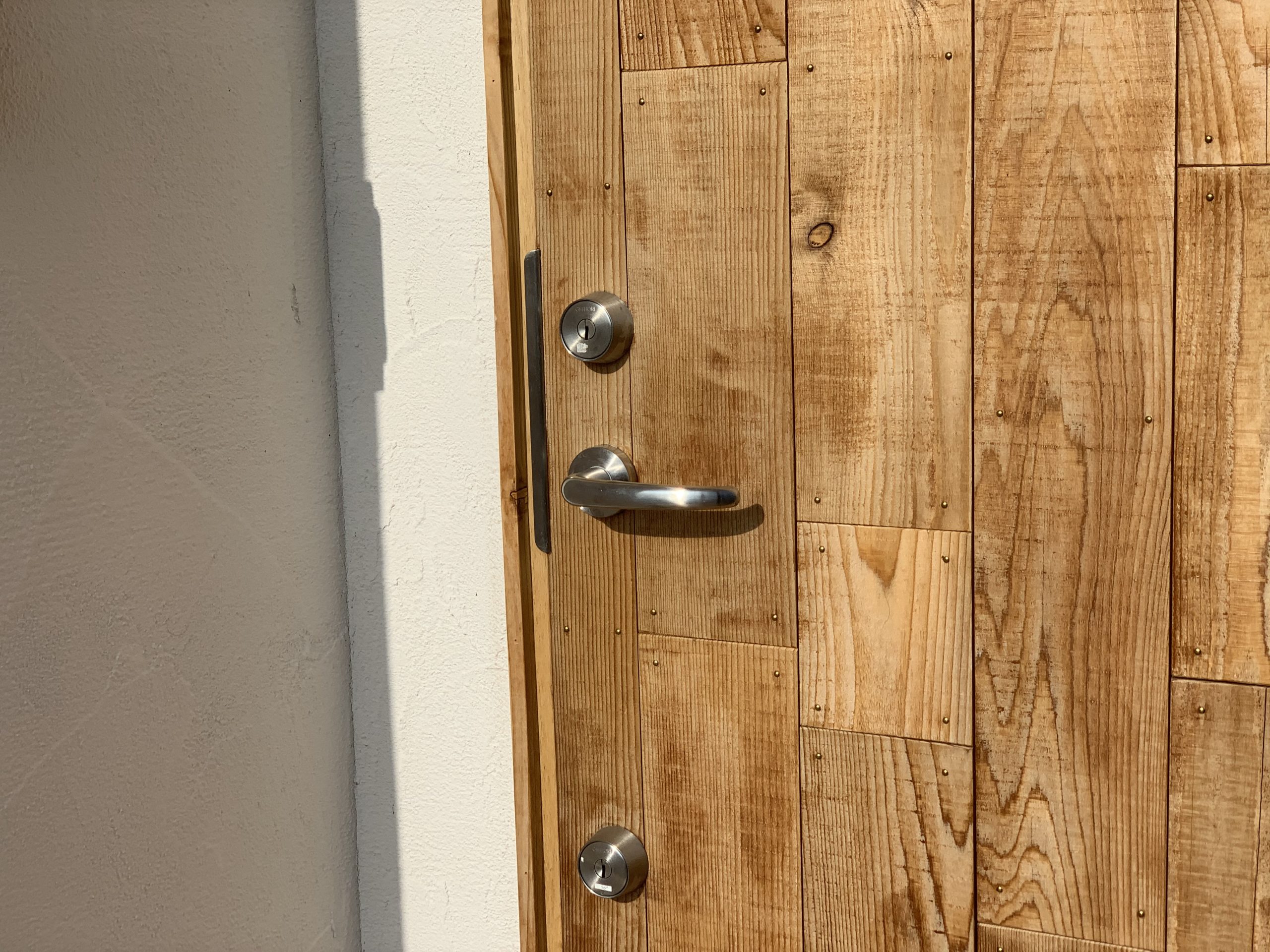 玄関ドア:ガデリウス スウェーデンドア+ウエスタンレッドシーダー荒仕上材貼り