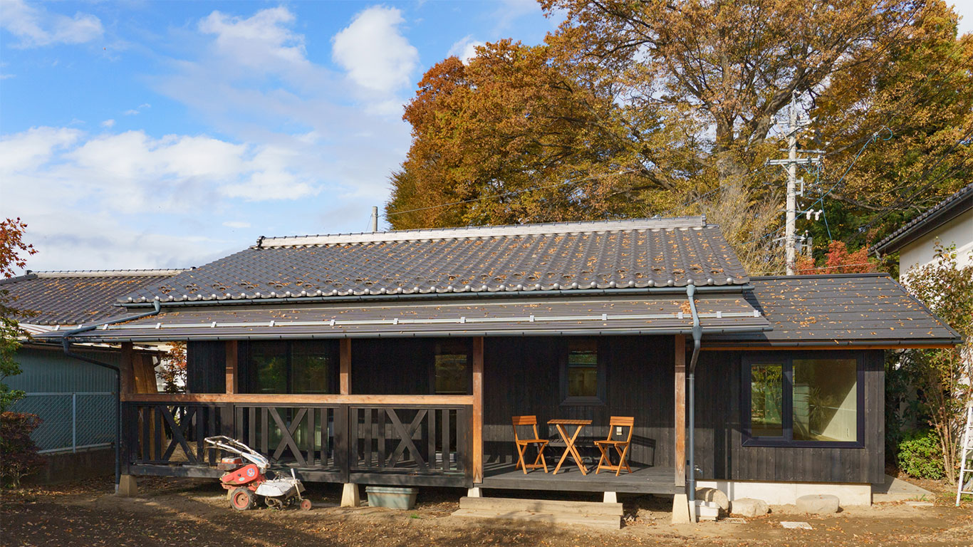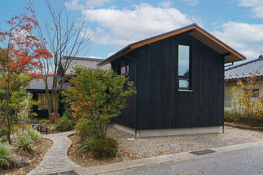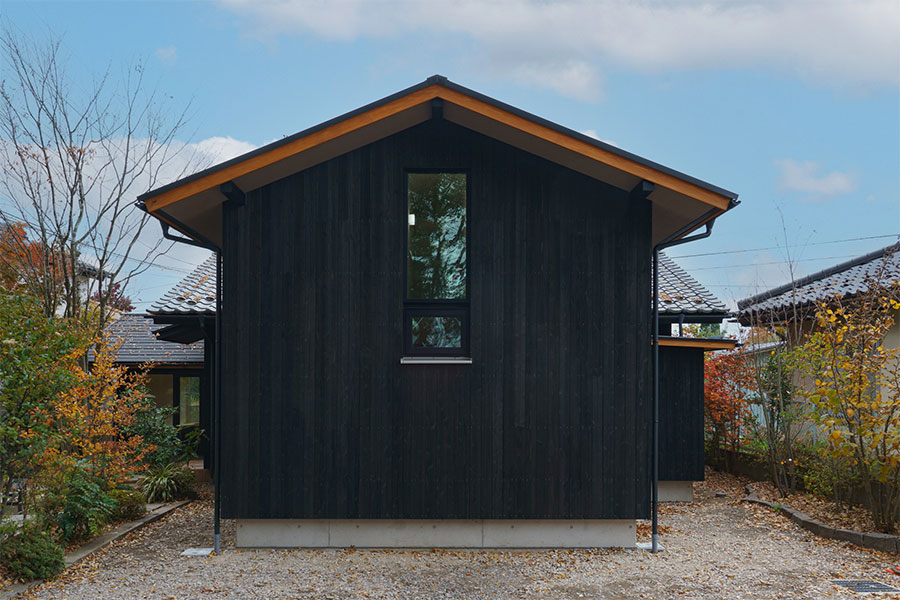 - 南面外観。中央の瓦葺平屋棟の東に平屋のリビングを増築した。 背後には道路を挟んで反対に隣接する神社のケヤキ大木がそびえる。