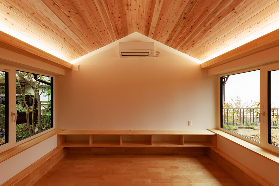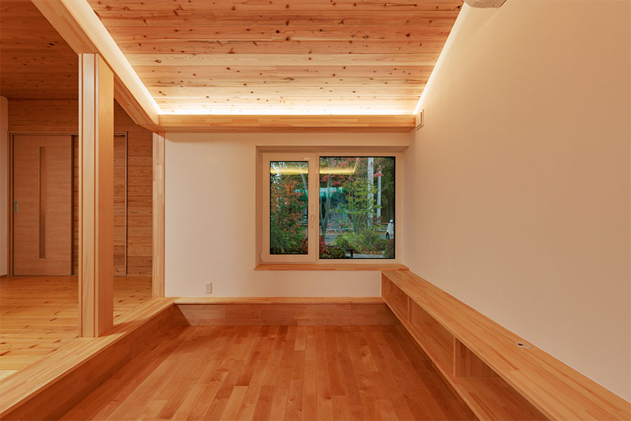 - すぎ羽目板の勾配天井にやさしい間接照明が。 ここは基礎断熱工法となっており、立上り基礎面に100㎜厚の断熱材を貼っているため、内壁側にベンチ状の台が発生している。
