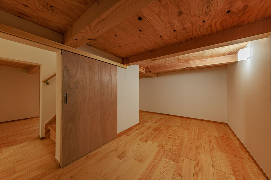 - スキップフロアの階下、床下収納です。天井高を1.4mに抑え、建築基準法上は床面積に含まれません。