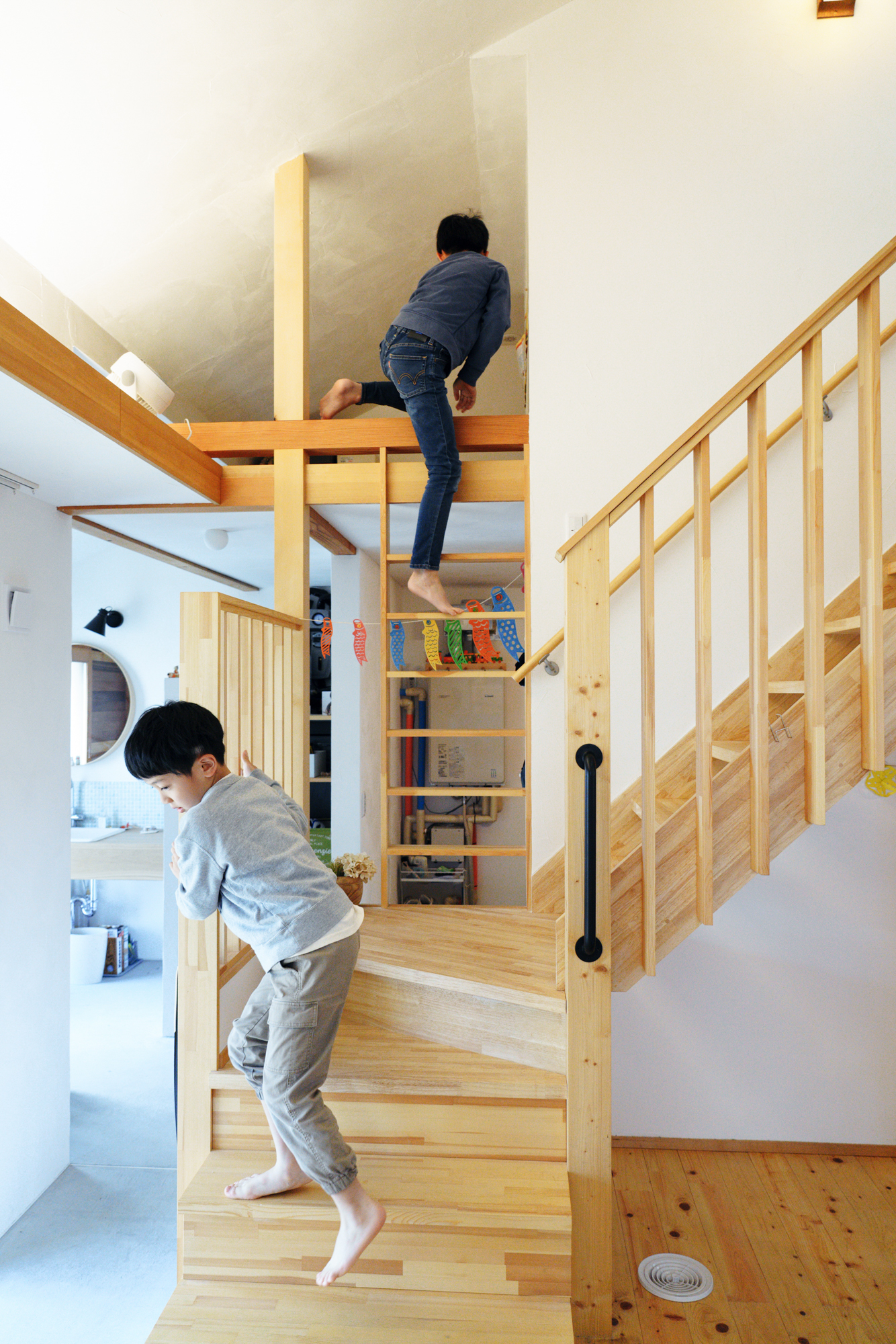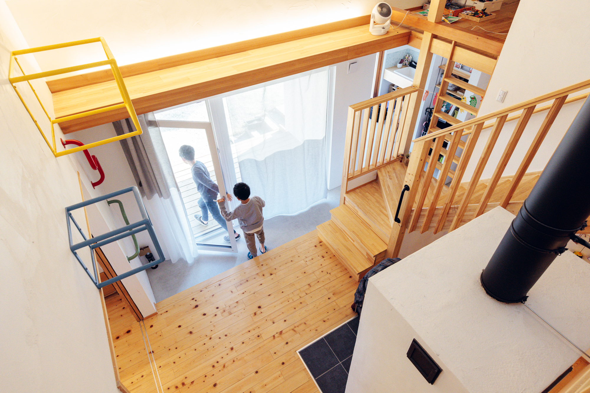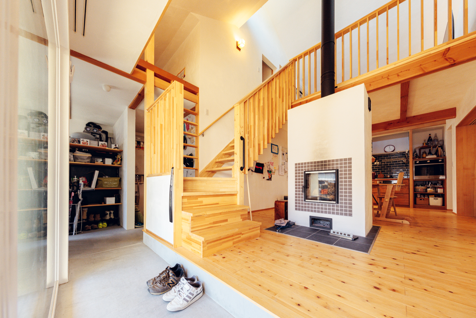 - 蓄熱型薪ストーブは住まい中央に設置し、吹き抜けを通じて住まい全体を暖めます