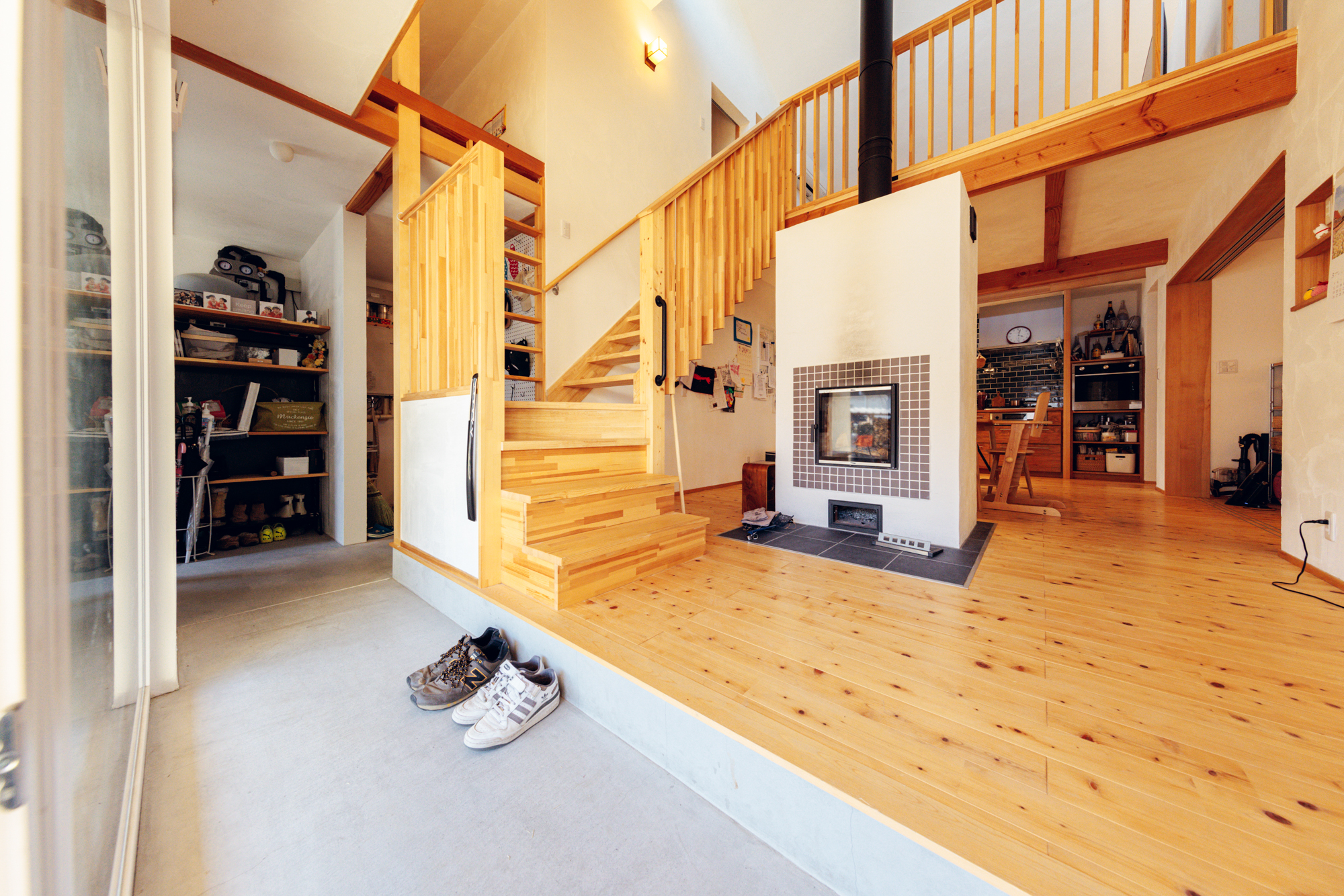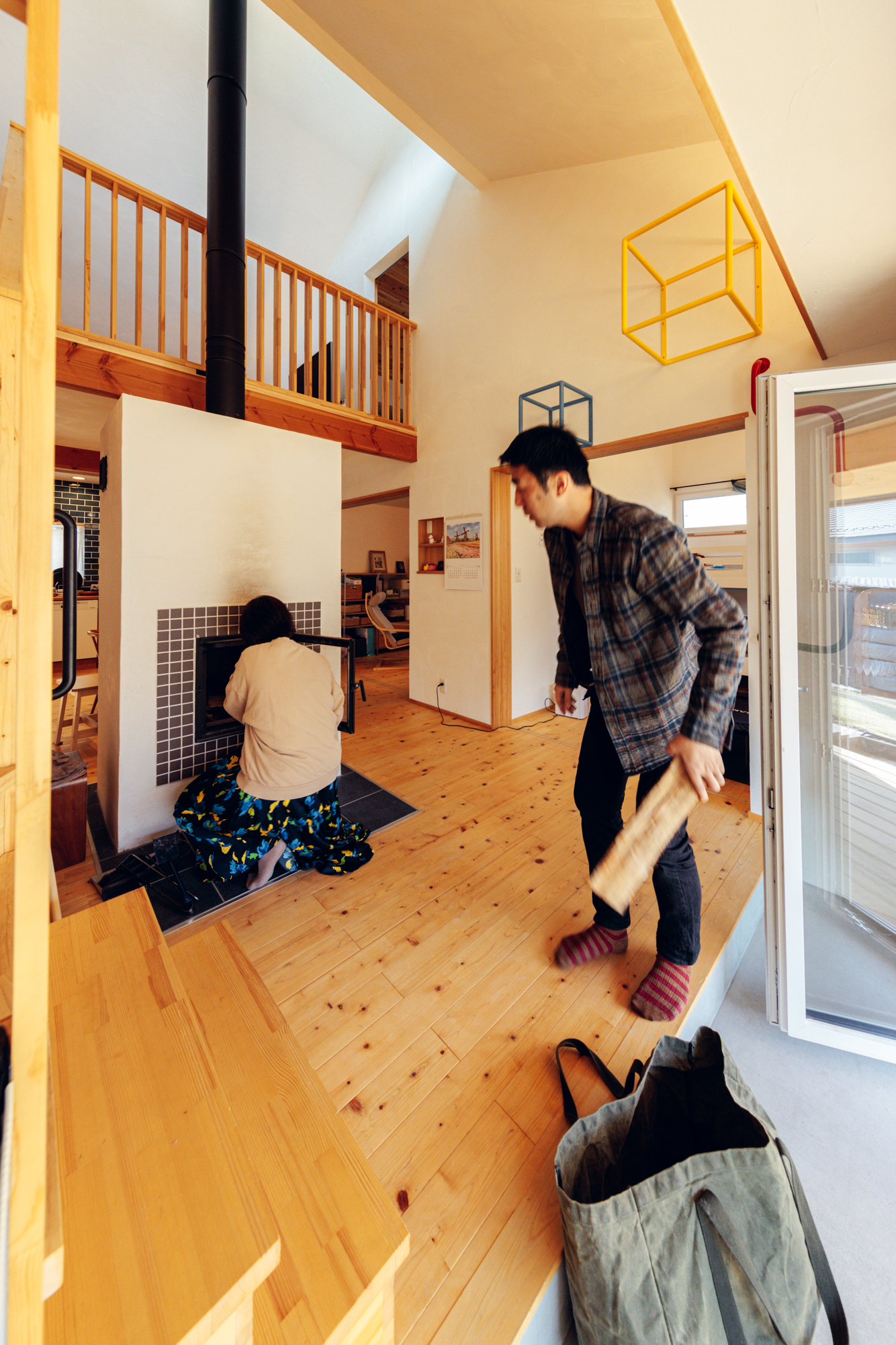 - 住まい中心に設置した薪ストーブ。吹き抜けを通じて住まい全体を暖めます