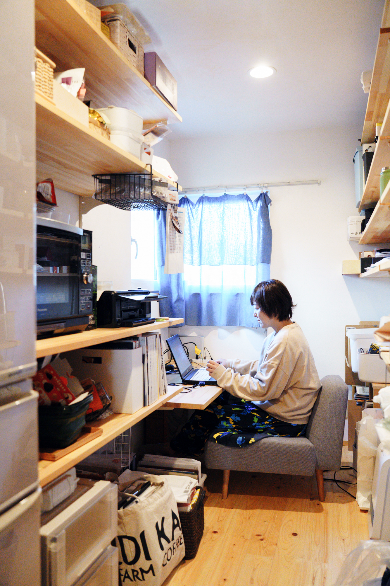 - パントリーの奥の仕事部屋。造作デスクの前面にL字型に設けた窓からは浅間山が見えます