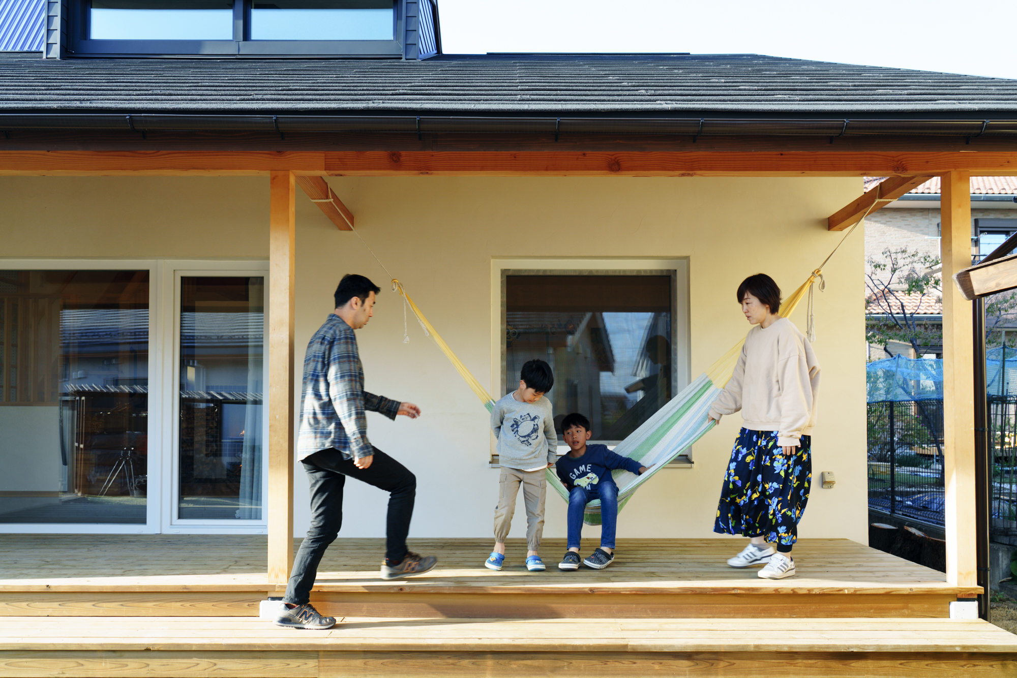 - 軒下にハンモックを吊って大人も子どももくつろげる場所に