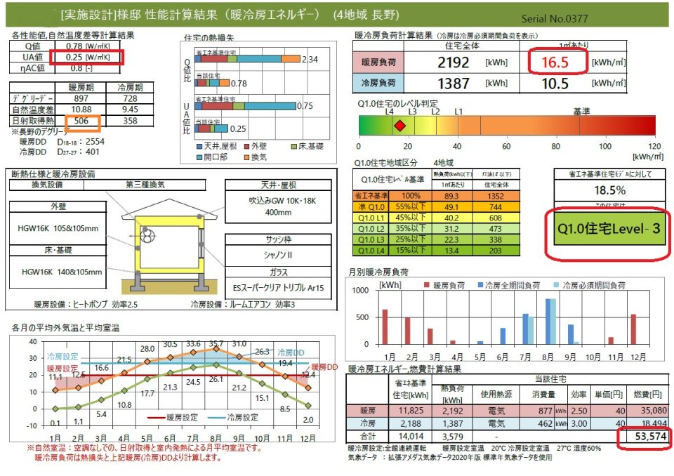 燃費性能はkwh/㎡(床面積あたりのエネルギー(電気kwh))で示されますが、この家は16.5kwh/㎡。