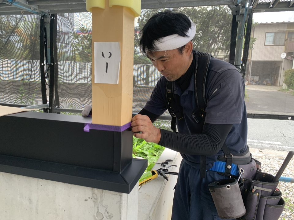 黄色い養生カバーがついている柱の間には目隠し用のたてスリットが細かめに入ります。