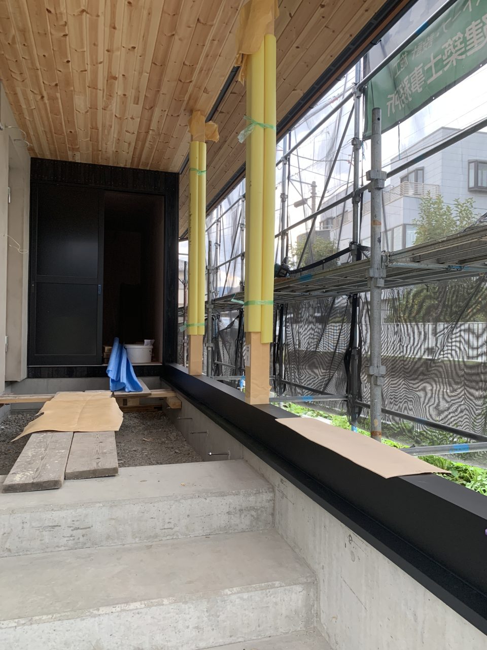 玄関ポーチはウッドデッキによるものになりまして、足場が撤去される寸前、
