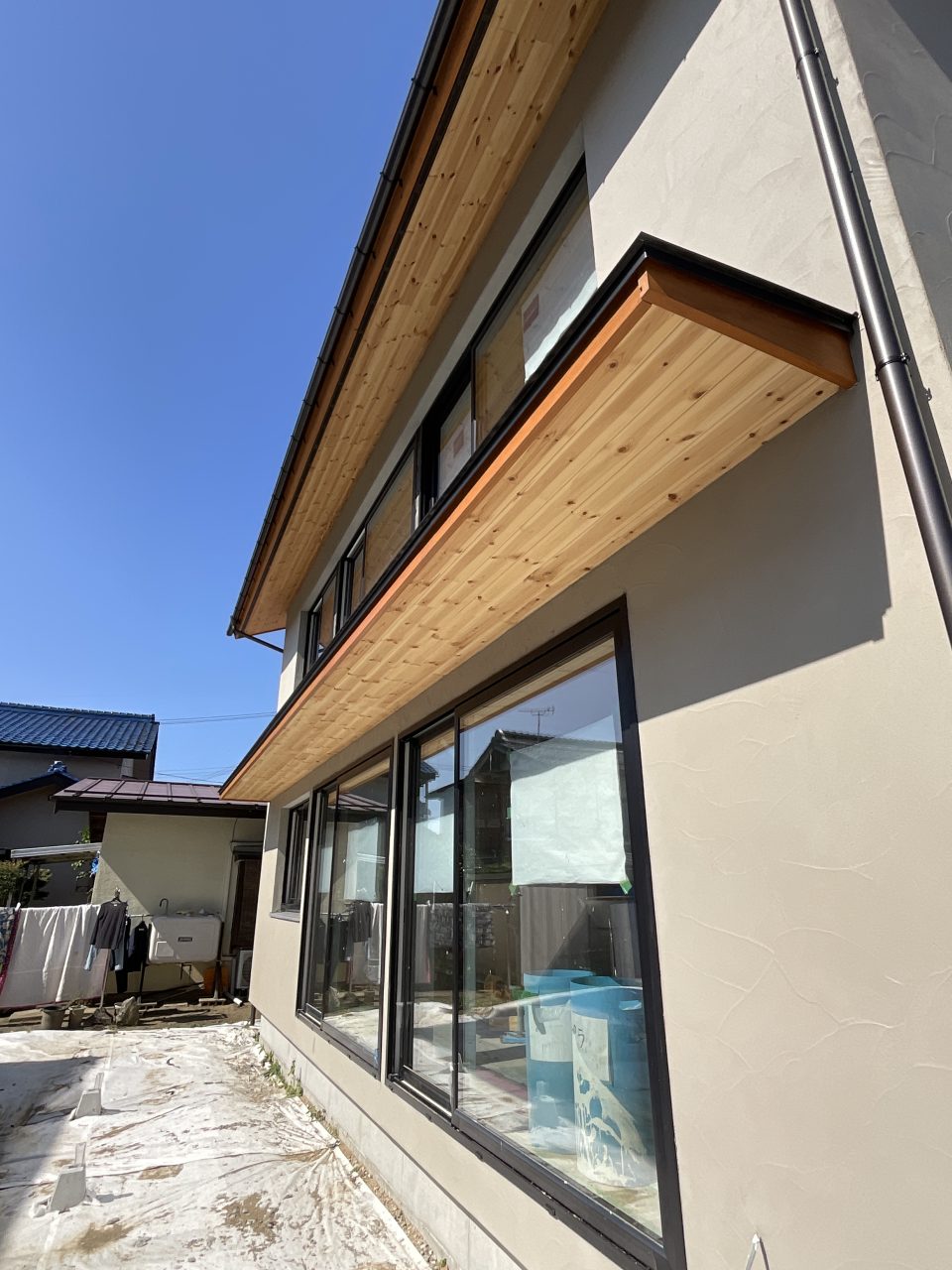 1階窓上には出幅90㎝の庇(ひさし)を設けて日射を遮るのがセオリー。