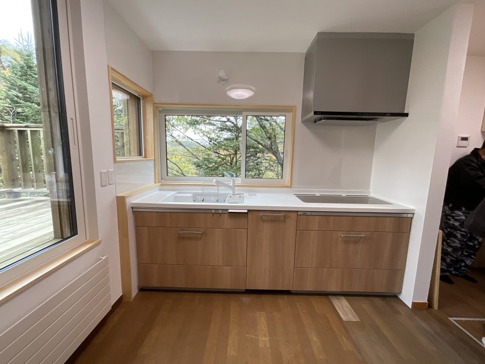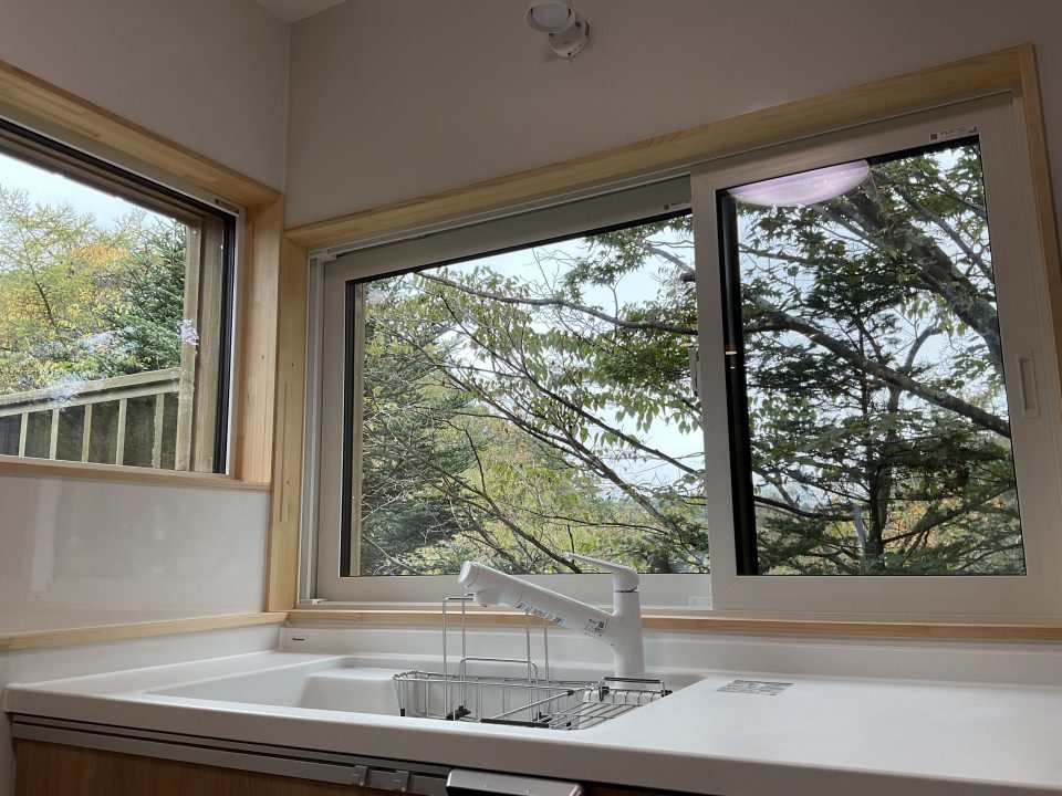 北向きに配置換えを行った壁付けキッチンの眼前は大きな窓で(もちろんトリプルガラス入り樹脂サッシ=シャノンNS50)、眺望が広がりルンルンキッチンに生まれ変わりました。