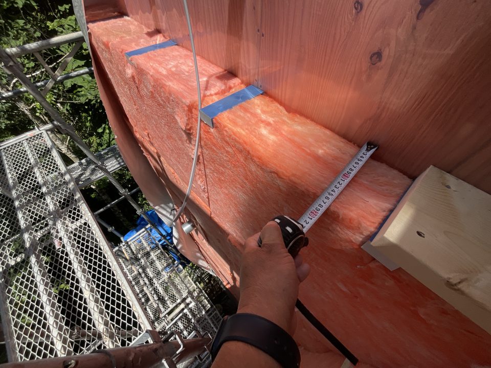 今回断熱はかなりしっかりやりまして、KYブラケットにて、外壁は高性能グラスウール16Kを180㎜付加しました。