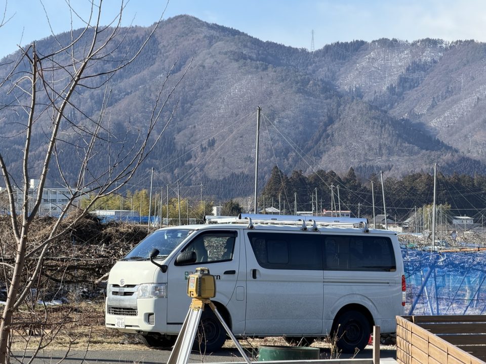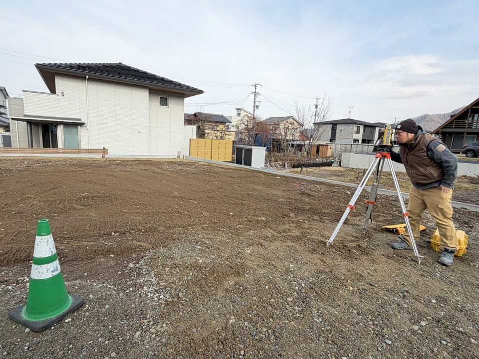 昨年のうちに擁壁+盛土の造成工事を終えており、初日の今日はまず測量から。