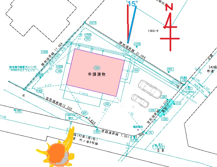境界ラインとは切り離して、真北から15°振って配置しているためです。