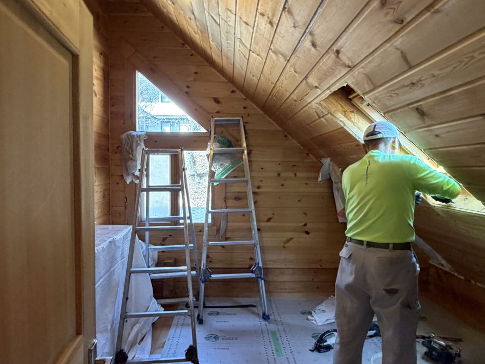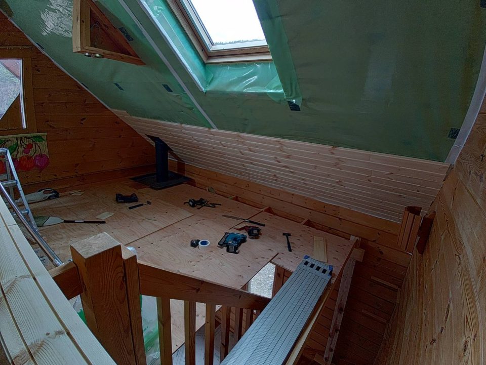 今回は大工事を回避し、「既存の天井の板はそのままで、室内側から防湿シートを全面にしっかりと隙間なく張り詰め、さらにそのシートの上から仕上げとして新たに12mm厚のパイン羽目板を施工する」という方法をとることにしました。