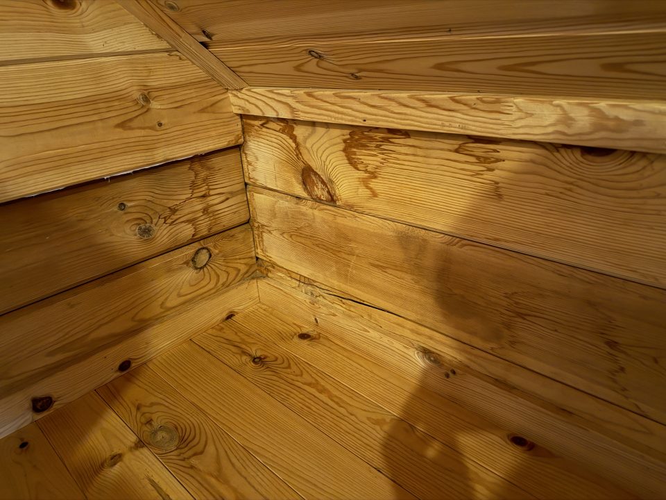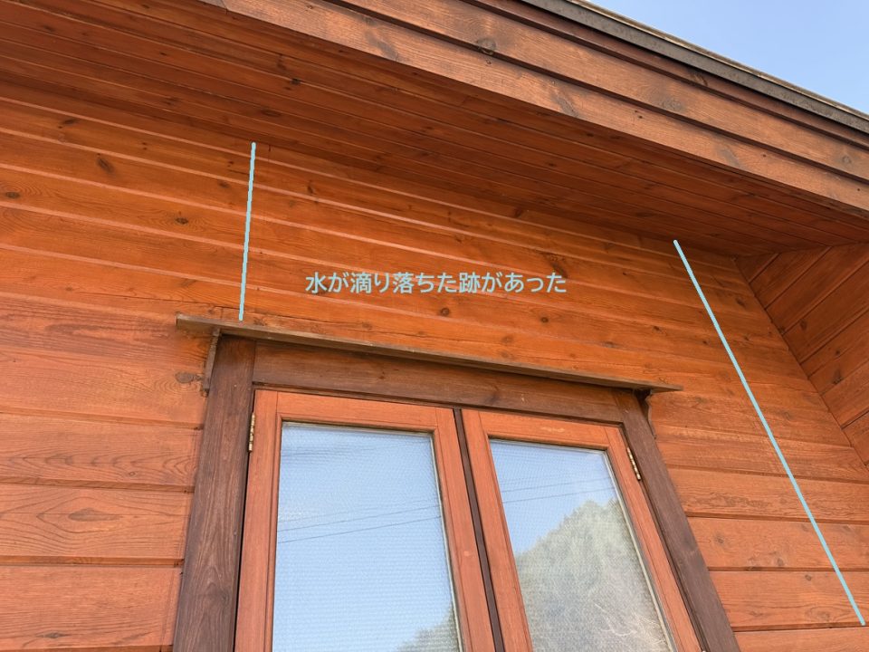 聴けば、ログを積んだ1階の外部壁にも水跡が。