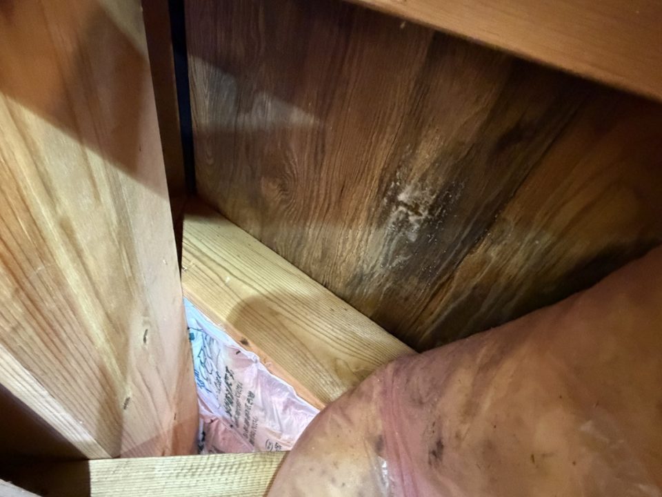 垂木(ツーバイエイト)も黒く変色し(=黒カビ)、グラスウールを絞ると水がポタポタと滴り落ちるほどの深刻な状態。木材が腐る一歩手前でした。
