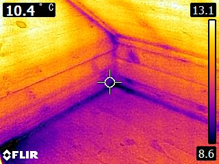 サーモグラフィーを持参したので表面温度を測ってみると、けっこうな温度ムラがありました。