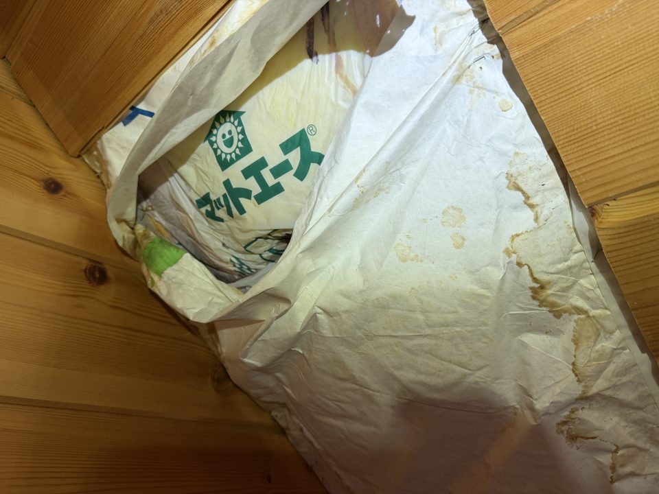 屋根の内部には100mmの袋入りグラスウールが入っていましたが、室内側にあるべき「防湿シート」がなく、なぜか「透湿防水シート(タイベック)」が貼られていました。 これでは室内の湿気を含んだ暖かい空気が容赦なく屋根裏へ侵入してしまいます。