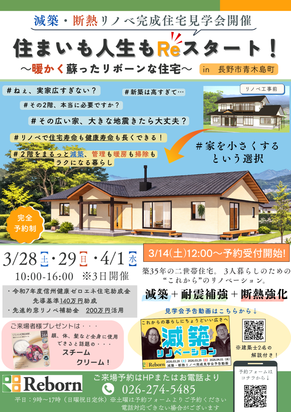 ■3/28.3/29.4/1減築・断熱リノベ完成見学会情報&ご予約