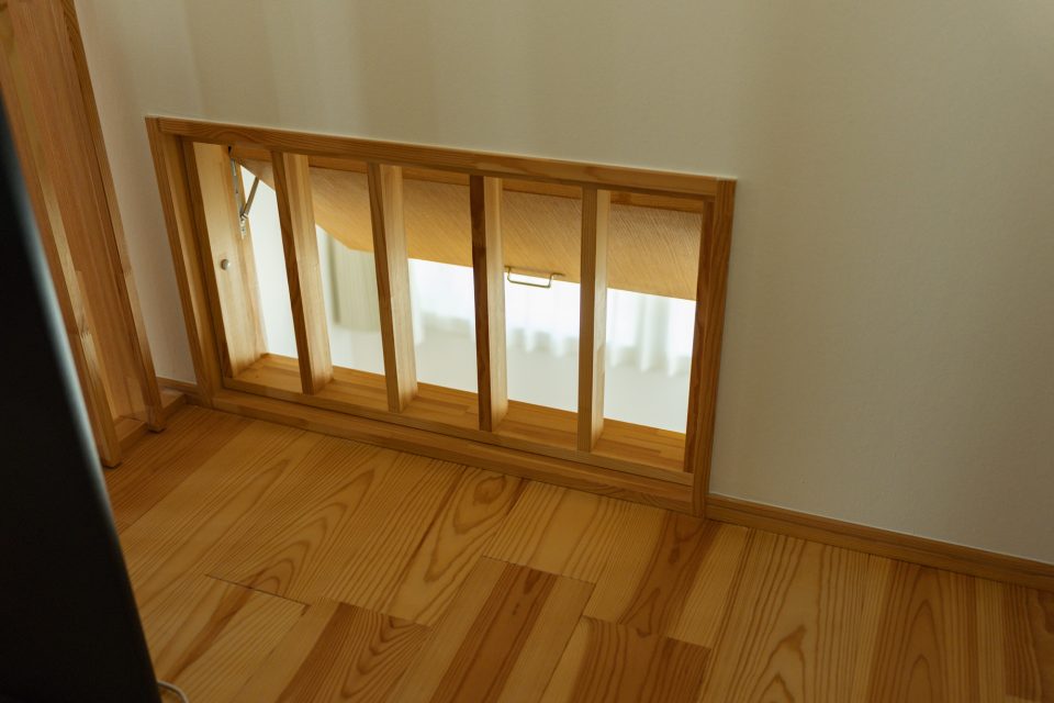 エアコンの冷気が1階まで送られるよう、壁の下に換気窓を設計。窓の向こうは壁に囲まれた1階の寝室