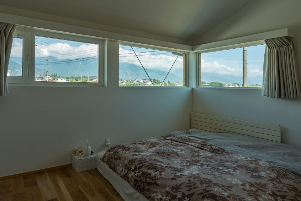 1階北東側の寝室。道路からの視線が気にならない高さにL字型に窓をデザイン