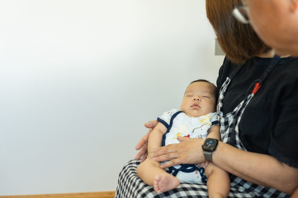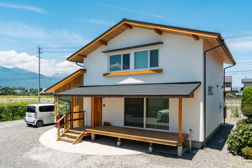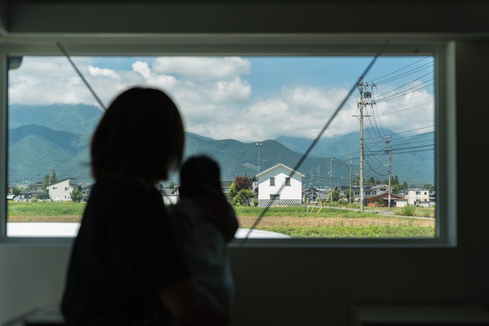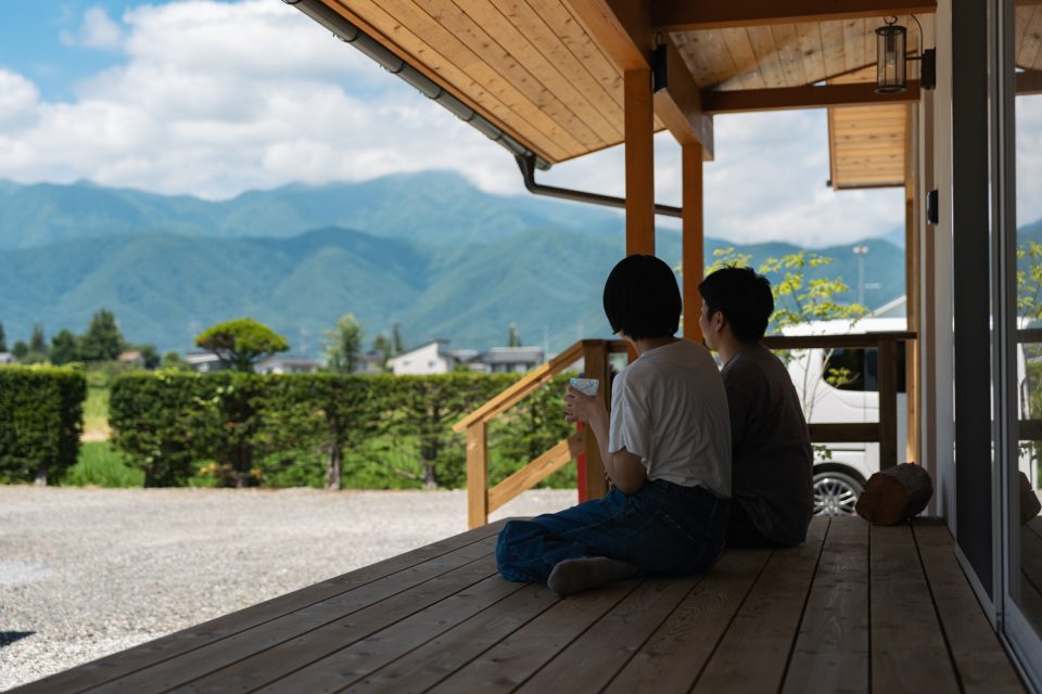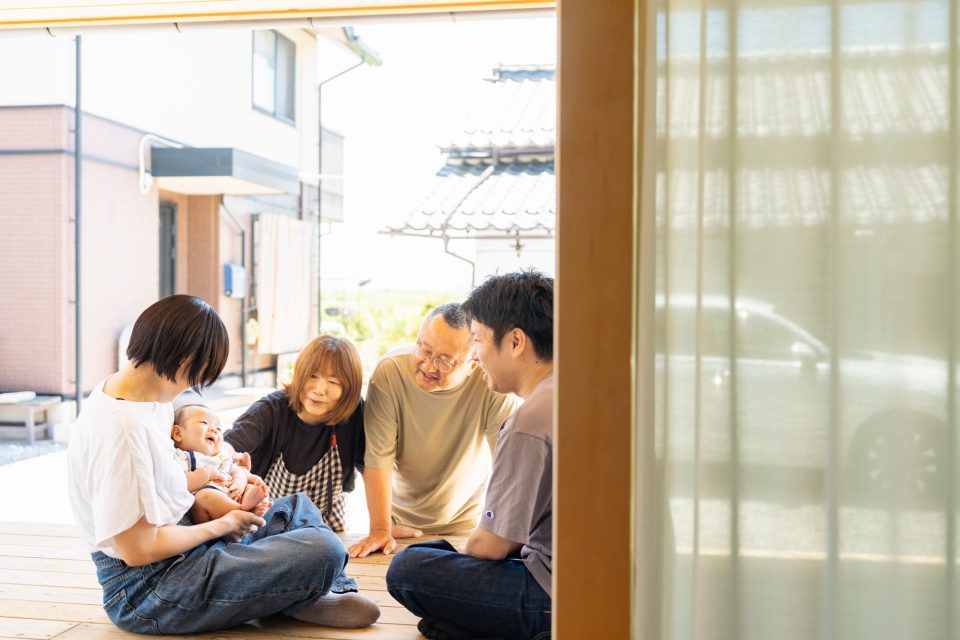 青々とした田園の向こうに、雲をまとう山々がゆったりと広がる安曇野の住宅街。心地よい日陰のデッキテラスでは、生まれたばかりの赤ちゃんとSさん夫妻、祖父母の3世代で過ごす、穏やかな時間が流れています。