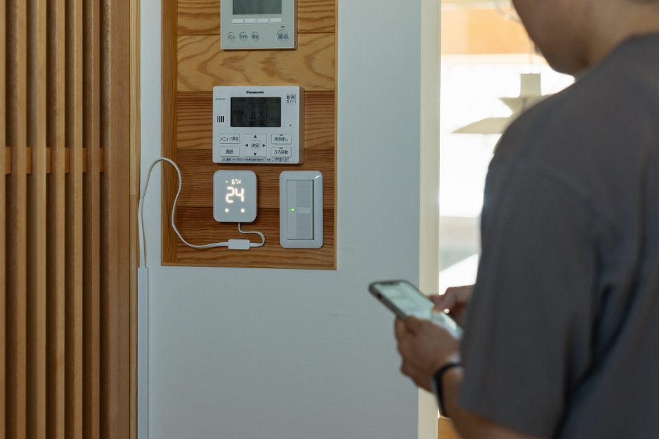 エアコンとつながったデバイスを壁面に取り付けて、操作はスマホで