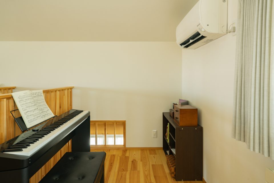 冷房用のエアコンは2階のホールに1台配置。階段や吹き抜けを通じて1階まで冷気が下ります