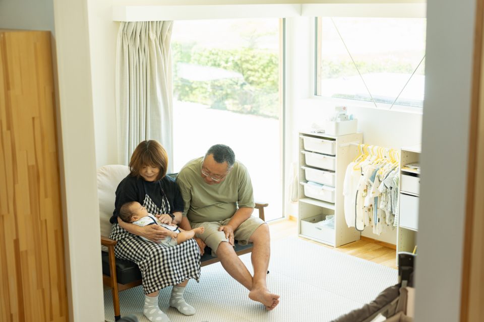 仲の良いご両親とSさん夫妻。取材中もご両親がリビングでお子さんの面倒を見ていてくれたため、撮影やインタビューをスムーズに進めることができて助かりました。とはいえ義理の両親が隣に住んでいるのは、夫のTさんとしてはさすがに気を遣うのでは?と思っていましたが、ご両親のさっぱりとしたお人柄に納得。Tさんも、ご両親を心から信頼していることが伝わってきました。寝巻きのままで行き来できる距離感は、子育ての上で本当に助かると思います。