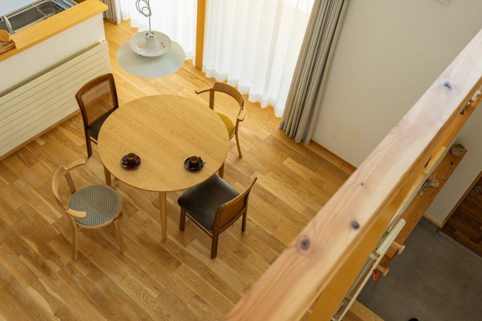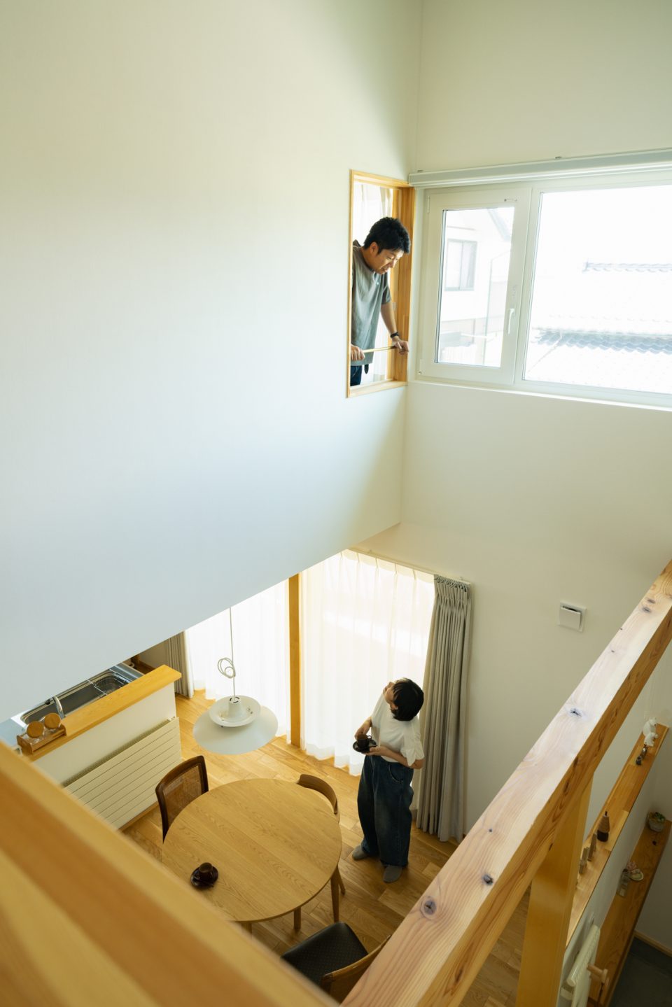 2階の子ども部屋の窓から吹き抜けを介してダイニングと会話ができます