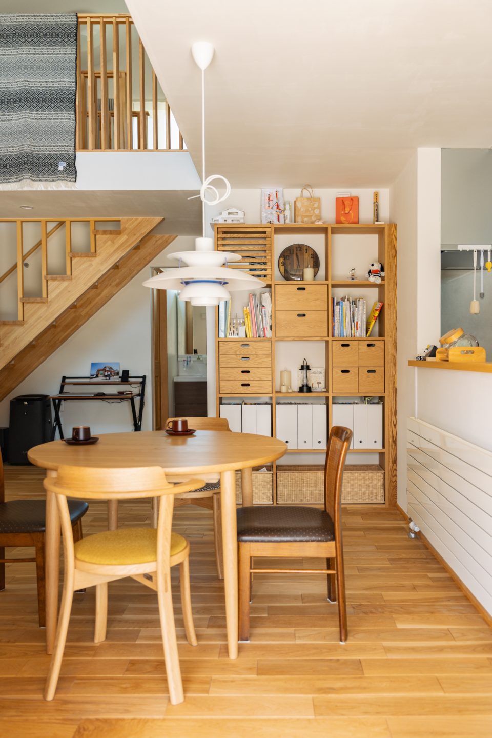 子どもが生まれることを想定してキッチンからリビングがよく見えるワンルームも考えましたが、「食事の場と、休憩したりテレビを見たりする場を分けた方がいい」と塩原さんにアドバイスを受けて緩やかに分けることに。その結果リビングとダイニングに違う個性が生まれ、気持ちを切り替えて過ごせる間取りになりました。
