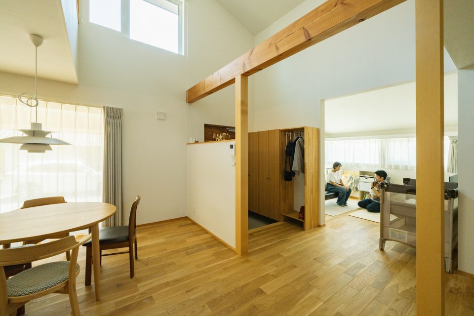 奥がリビング、手前がダイニング。間仕切り壁はありませんが、中央の玄関ホールで空間を緩やかに分けることで気分を変えて過ごせるように
