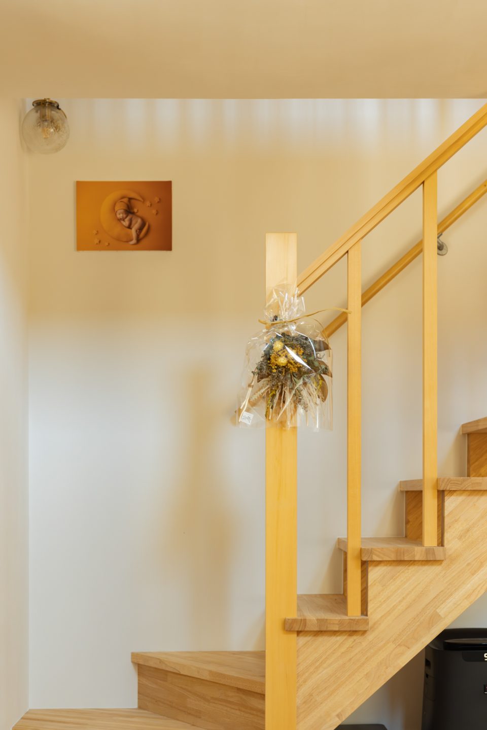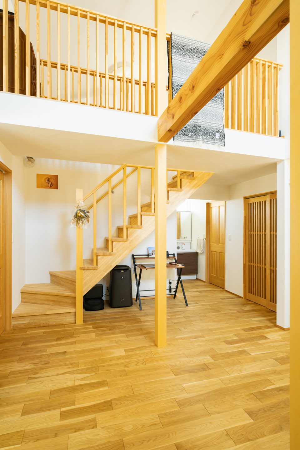 玄関を入ると吹き抜けの広いホール。夫妻の希望でリビング階段を設け、2階とも気配がつながるように。右奥が洗面室と浴室