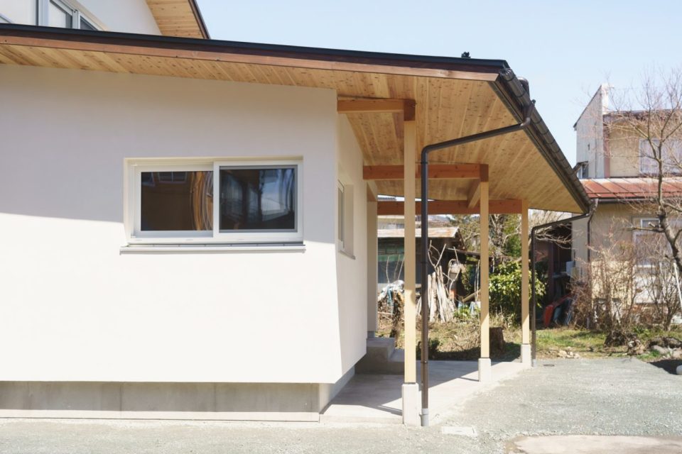 直射日光が入らない長い軒の下屋は雪対策で一寸勾配の頑丈な設計に