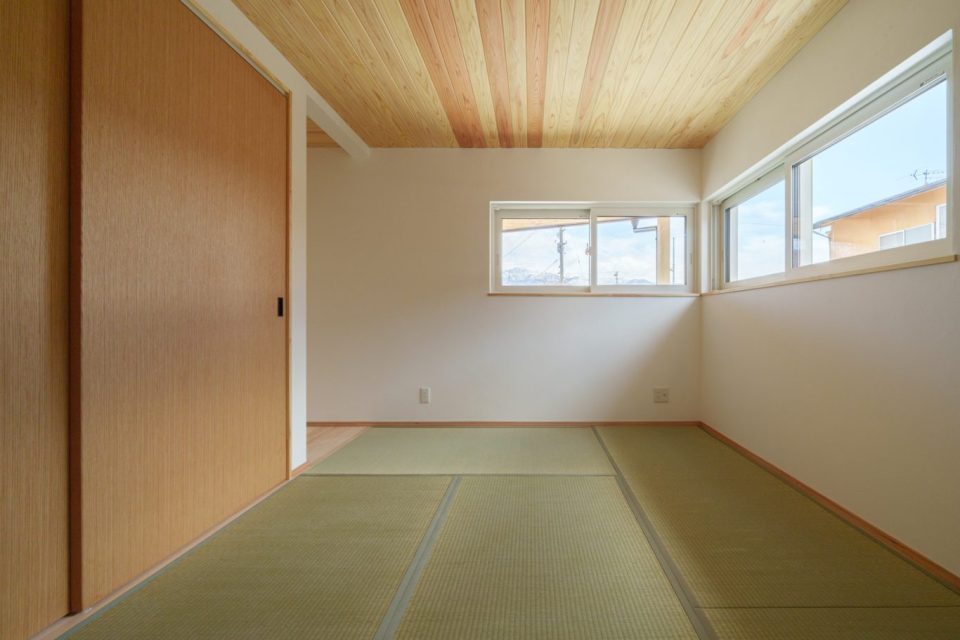 い草の畳を敷き、低めの天井で落ち着きがある6帖の和室空間
