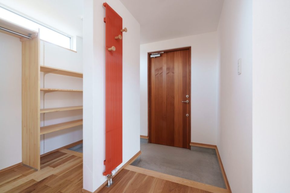 玄関脇のシューズクロークは見学会を参考に希望したもの。ビビッドな色のパネルヒーターがアクセントに
