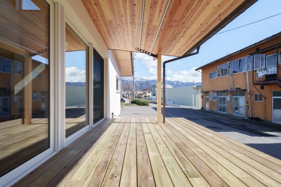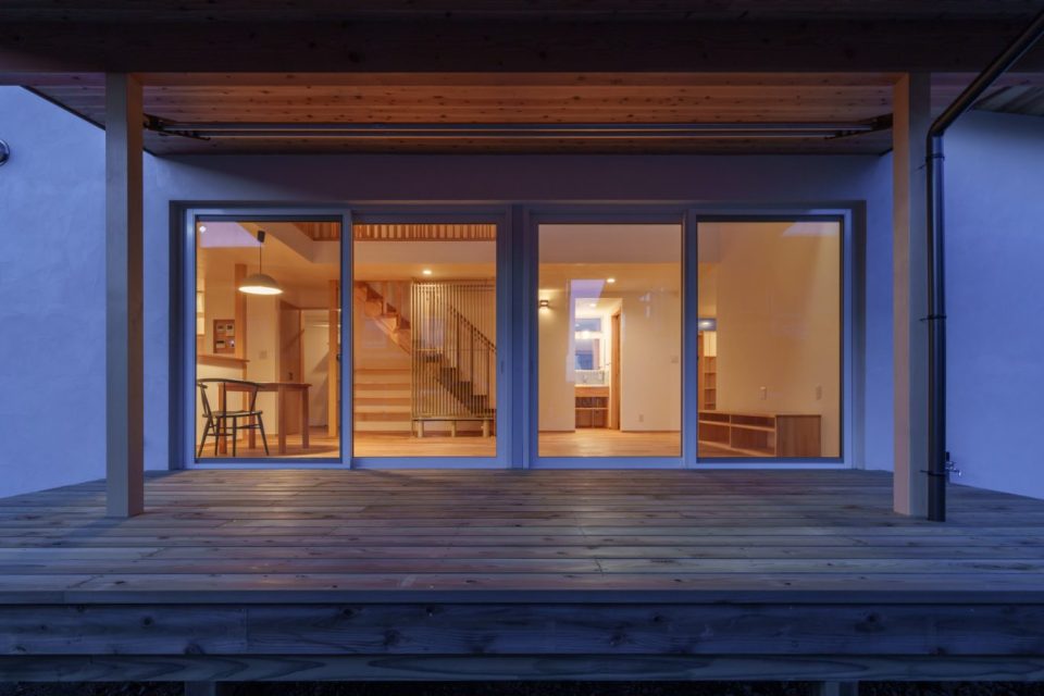 リビングとフラットにつながるデッキテラスは屋根付きの中間領域として、家族の憩いの空間に