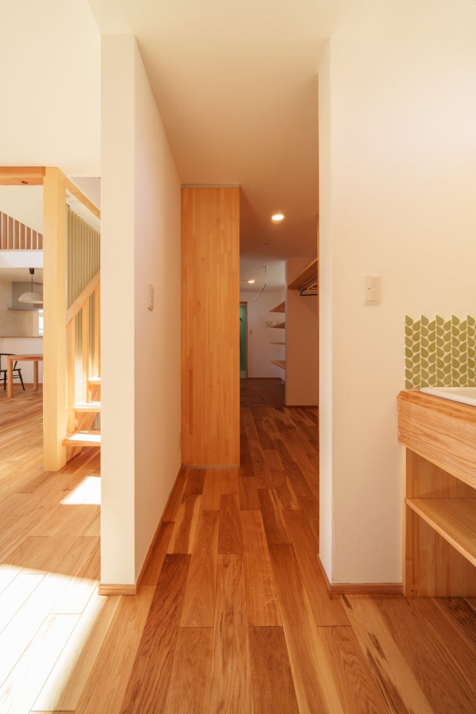 さらに、リビングから2階へとつながる階段もご夫妻の希望でした。子どもたちが思春期を迎えても、帰宅した際に自然と家族で顔を合わせられる動線を考えたとか。ファミリークローゼットや玄関ホールなどの共有スペースもリビングを中心に設計されているので、家族のコミュニケーションが自然に生まれています。