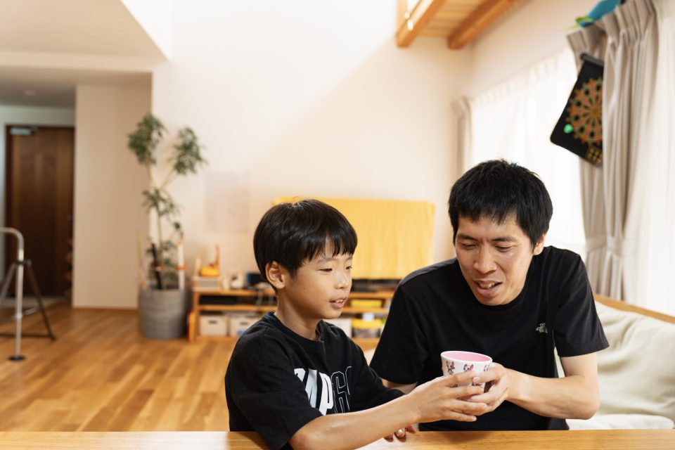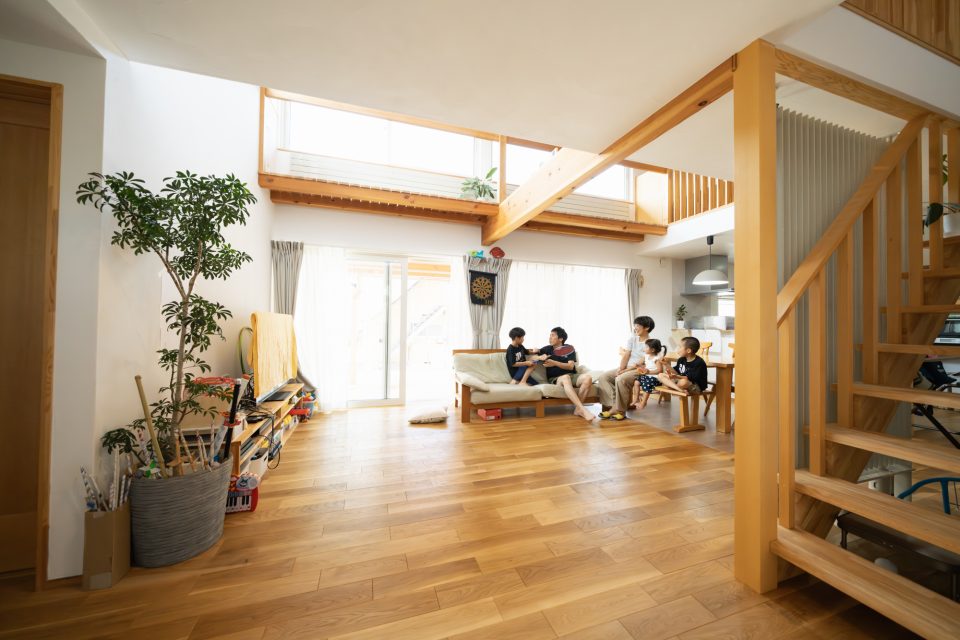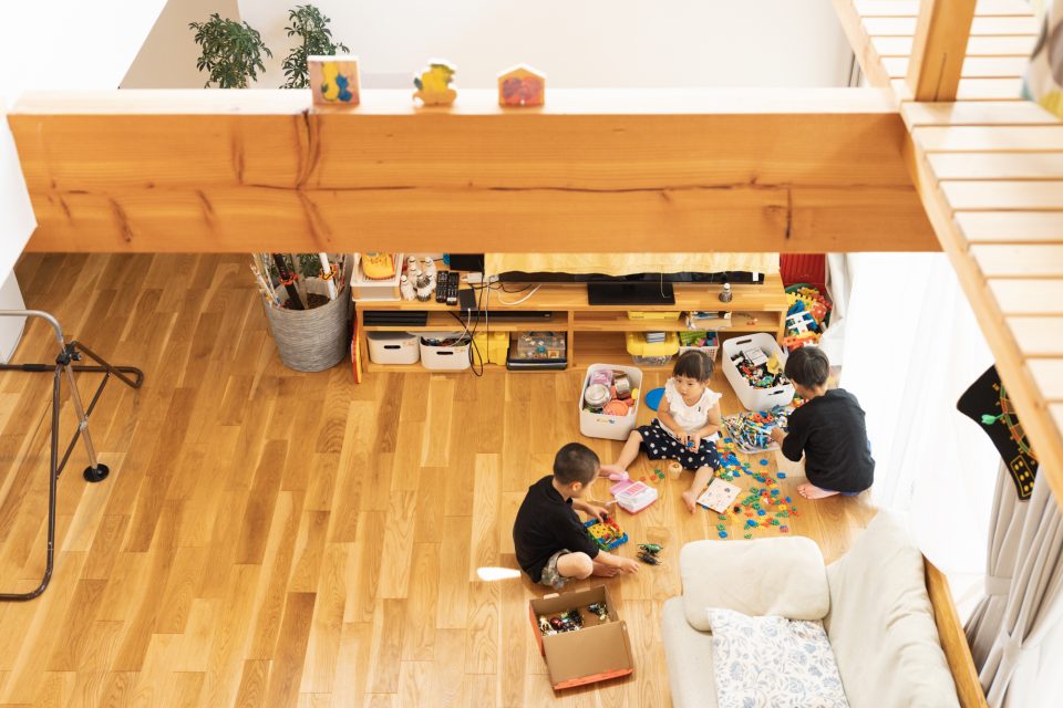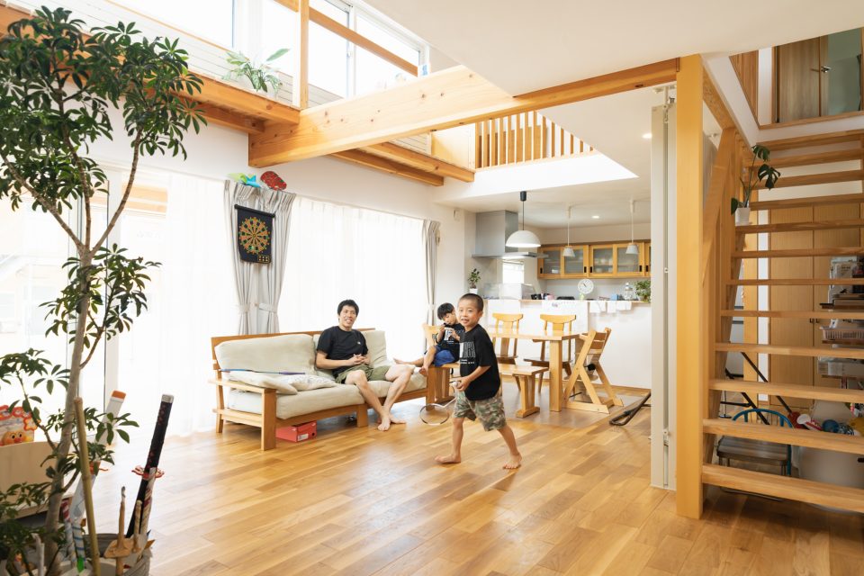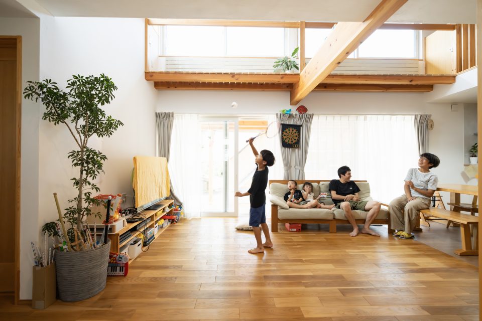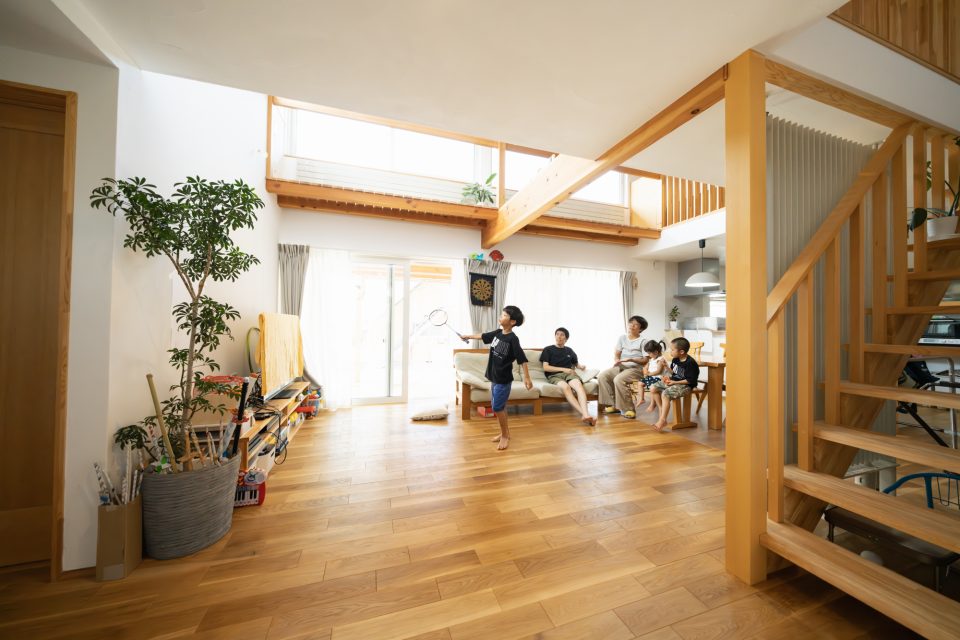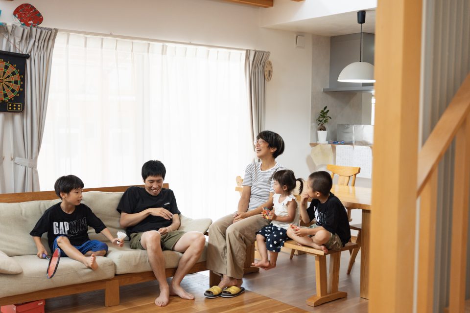 吹き抜けの上階から子どもたちのにぎやかな声が響き渡るYさん邸。長男(8歳)・次男(5歳)・長女(3歳)の3人が元気に走り回り、近所の友だちが遊びに来れば家の前で野球が始まります。そんな子どもたちの様子を温かく見守る夫のTさんと妻のIさん。家づくりのきっかけを尋ねると「昔はママとおとう(お父さん)で、ずっとおうちのケンカをしていたから」と次男のRくんがすかさず返答し、家族の明るい笑い声が広がります。