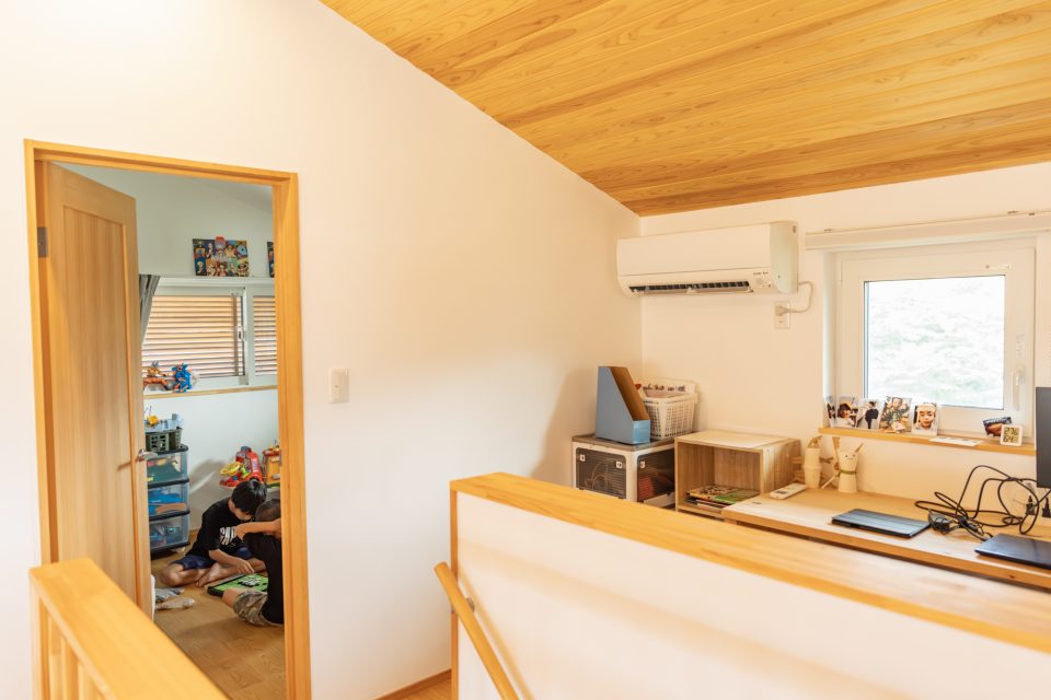 エアコンはワークスペースに設置。隣接する北西側に子ども部屋がある間取り