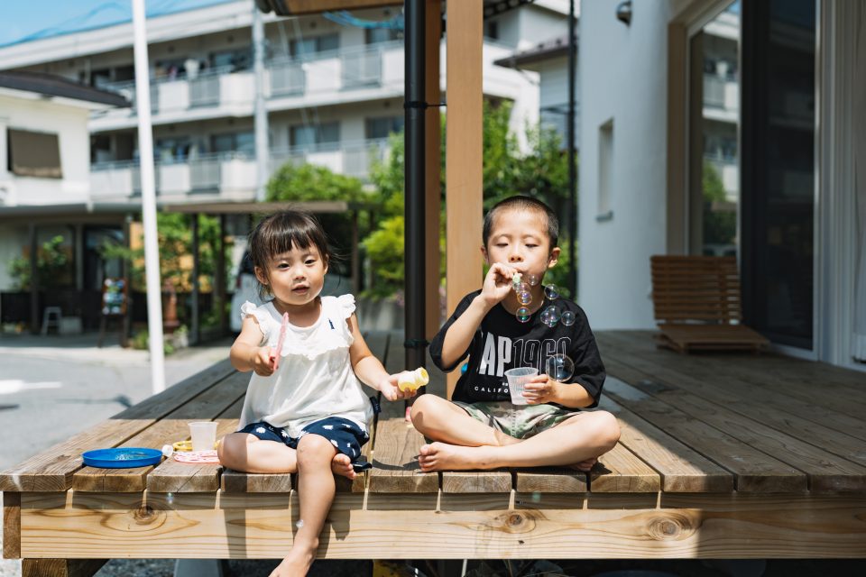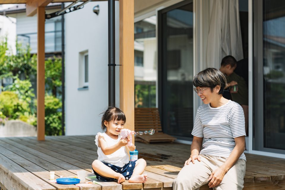 リビングから出てすぐにシャボン玉で遊べるのは、屋外のデッキテラスならでは