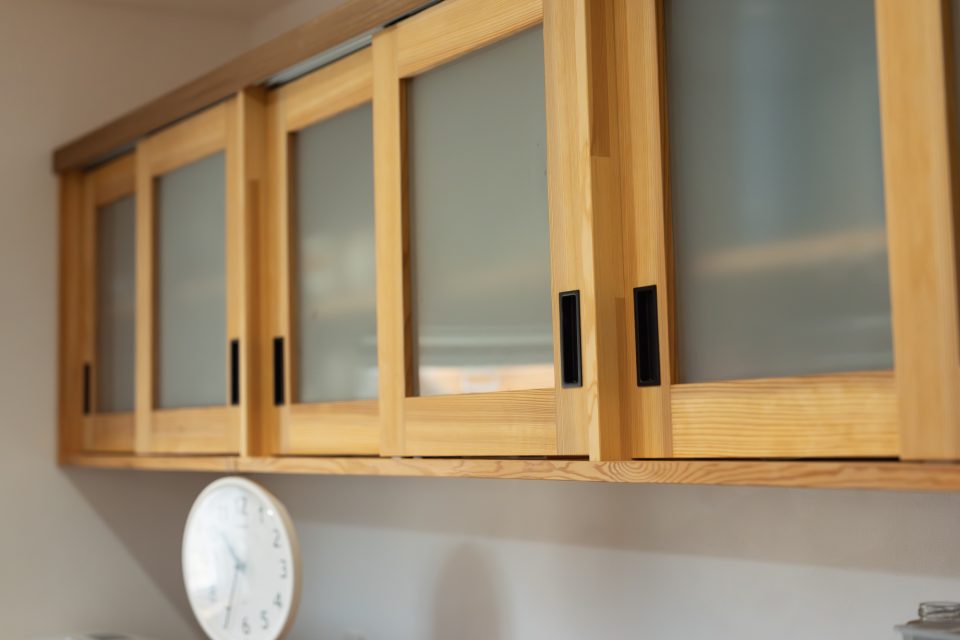 吊り戸棚には磨りガラスを設け、ソフトクローザーの扉で使いやすい