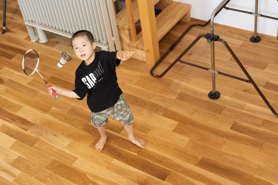 ほかにも、Yさん一家ならではの驚くべきリビングの活用法が、バドミントンのシャトルの壁打ちです。Tさんは学生時代にバドミントン部で、今は長男と次男もバドミントン教室に通っており、好きな時にリビングでラケットが振れるのがうれしいのだとか。