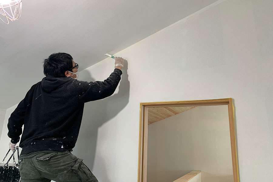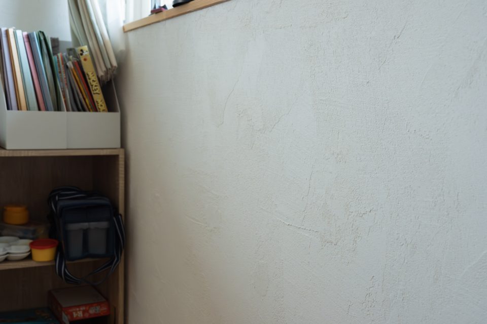 結果的に塩原さんがカゼイン不使用のスイス漆喰(カルクウォール)を探し出し、下地材のクロスも貼り直してくれたそう。そのうえで、謝罪も兼ねて漆喰の塗装は施主DIYではなくRebornで行うと申し出てくれたものの、記念として、2階の子ども部屋だけは自分たちで塗ったそうです。しかし、それでも例外なく大変だったとか。