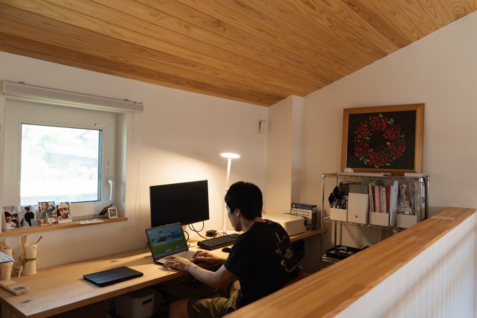 階段を上ってすぐのワークスペースは、家族が誰でも使えるフリースペース。Tさんがパソコン作業をしたり、子どもたちがゲームをしたりして楽しんでいます。