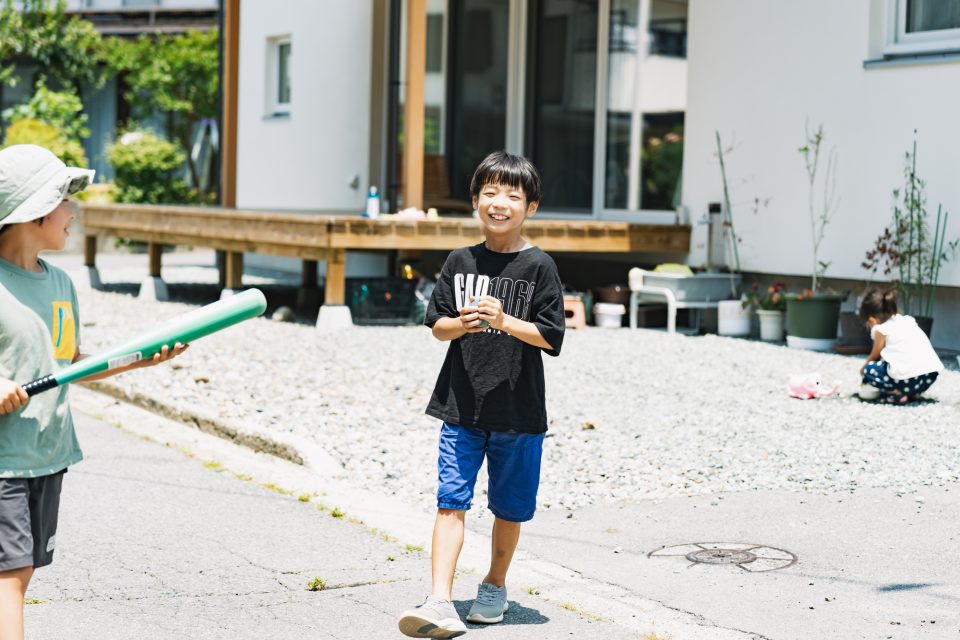 また、TさんもIさんも気兼ねなく質問や意見を伝えることができたのは、塩原さん自身も信念を持って家づくりに臨んでいる姿勢が伝わったからでしょう。「こんなこと聞いたら迷惑かな…」という遠慮が残っていると、不安を抱えたまま住まいの完成を迎えることになります。どんな小さな疑問も解消することが、家づくりの成功の鍵なのだと感じた取材でした。そして、撮影中に子どもたちの友人が遊びに来て、自然と家の前で野球が始まった和やかな光景にも癒された、心温まる取材となりました。