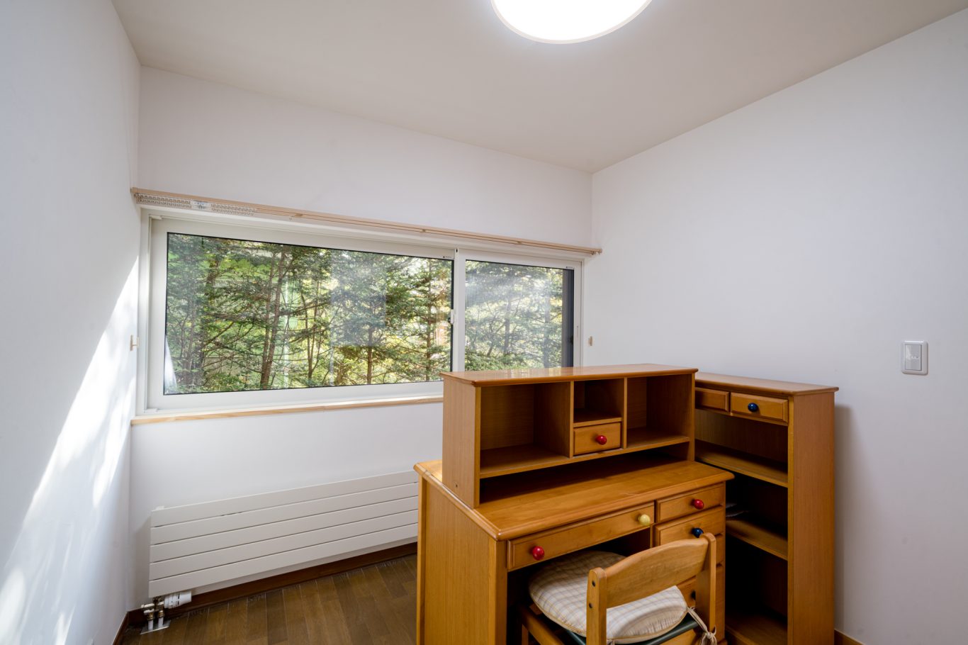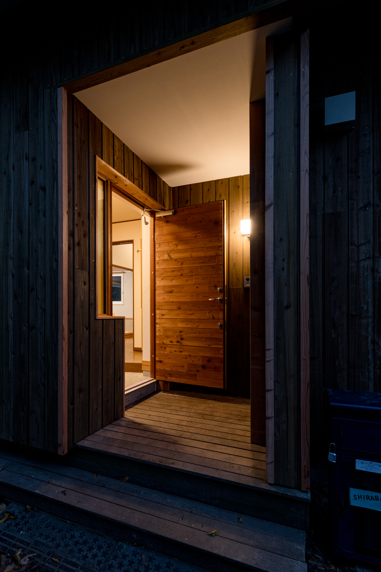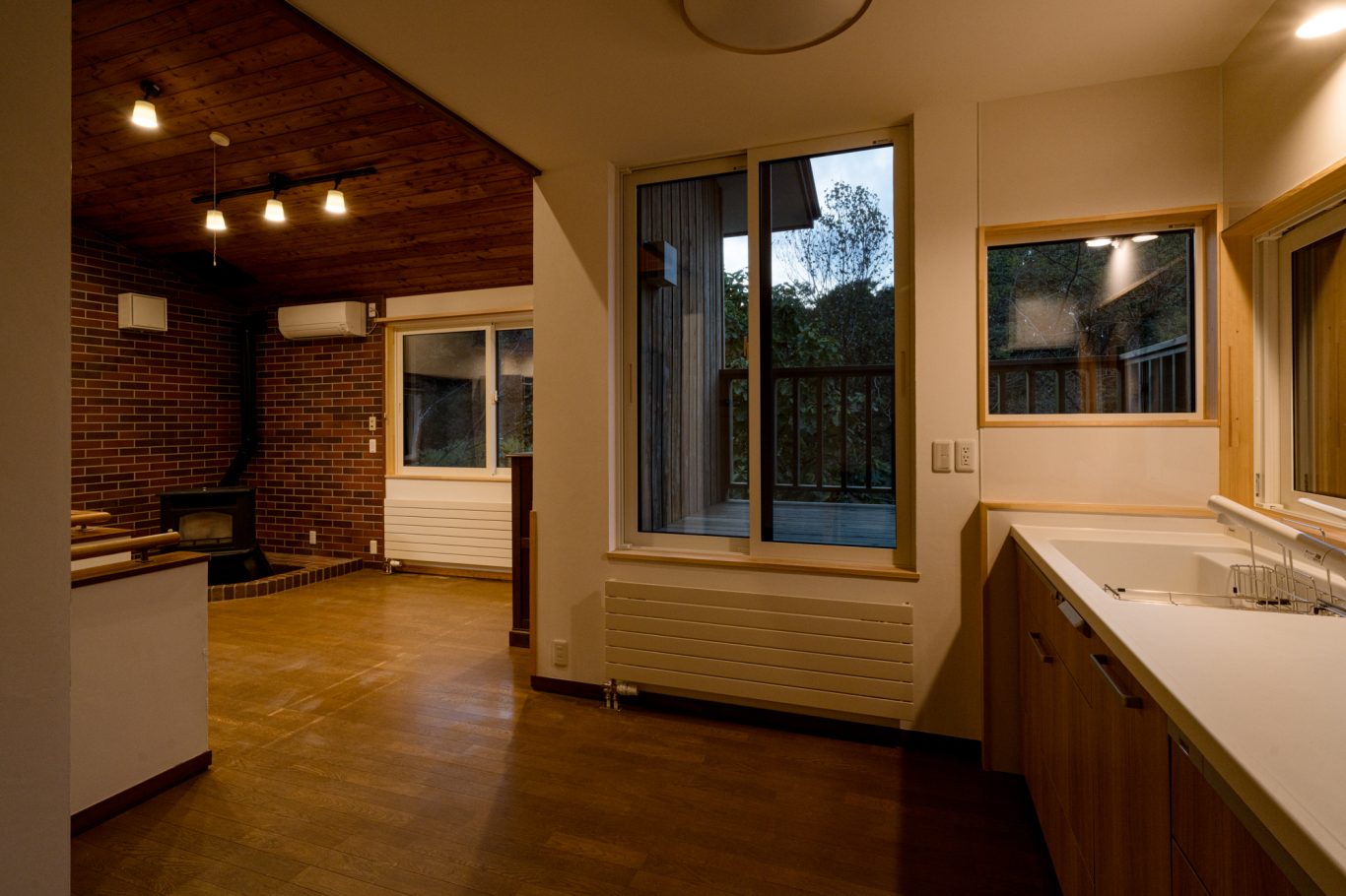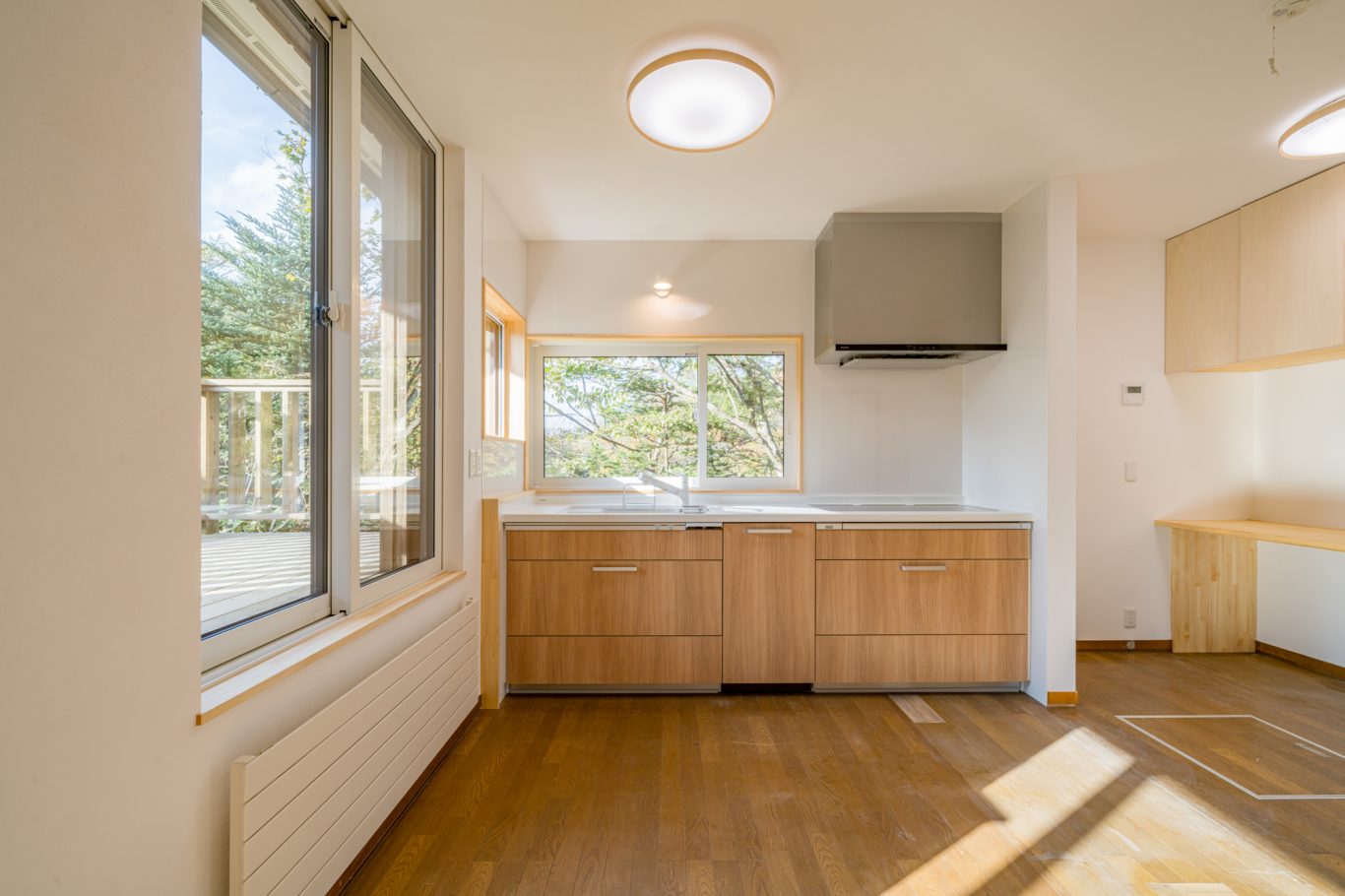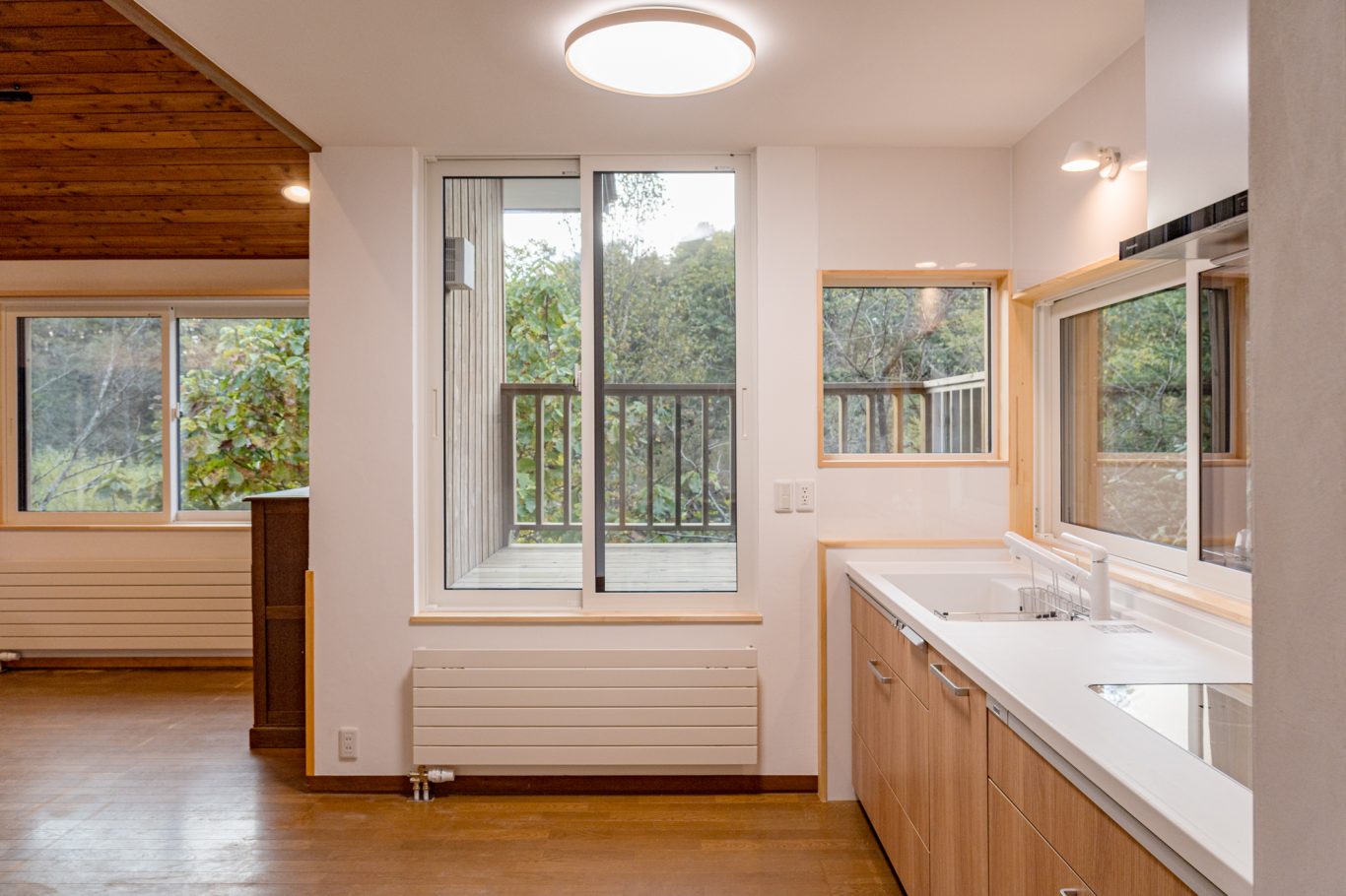 | 断熱 | Ua値:0.25 W/㎡K Q値:0.96 W/㎡K 暖房負荷:36.7 kWh/㎡ 外壁:HGW16K 180mm KYブラケット工法 天井:防湿シート+HGW16K(マット品)280mm(140+140) 床:吹込GW32K 300mm(床下側より・ユニットバス下共) 玄関は基礎内:スタイロエースII[3種B] 外100mm 内50mm 土間床50mm 樹脂サッシ:シャノンNS50 アルゴンガス入LOW-E 樹脂スペーサー 玄関ドア:ガデリウス スウェーデンドア Rebornオリジナル面材貼り =カラマツ羽目板・横張り |