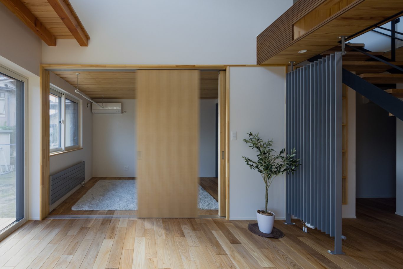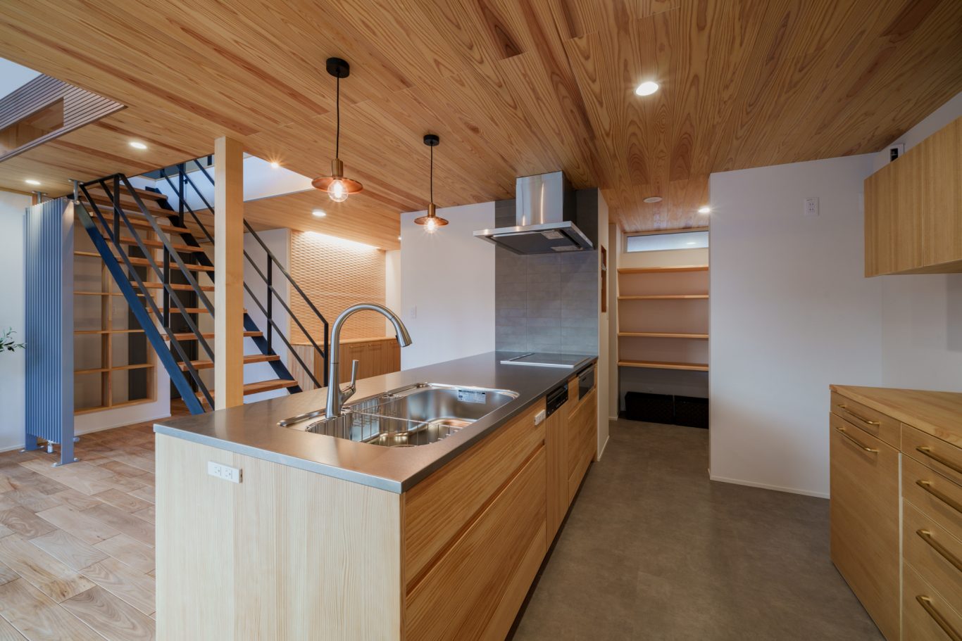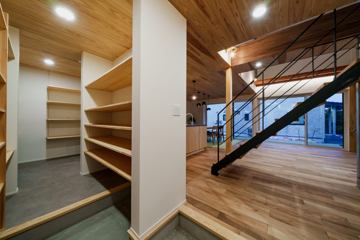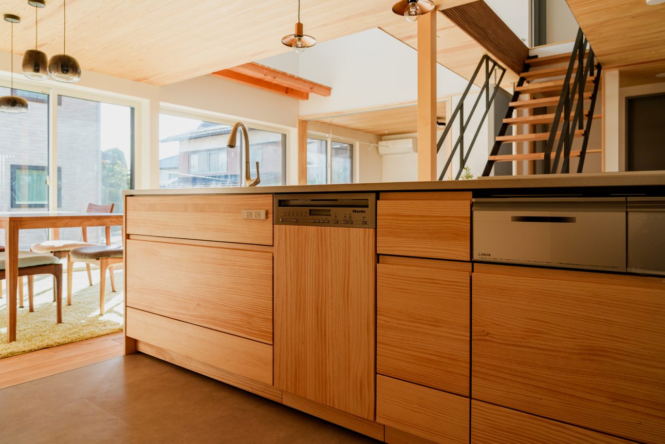 内装は入って正面の鉄骨階段から庭まで見通せる広々空間に、しっくい壁のホワイト、天井や無垢板のウッドにグレーの差し色が効いていて、まるでおしゃれなカフェのようです。
