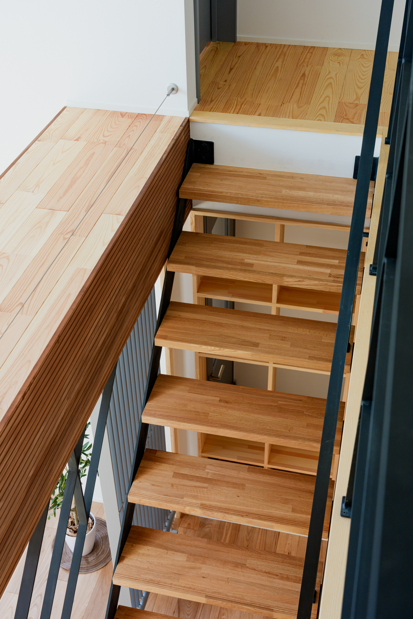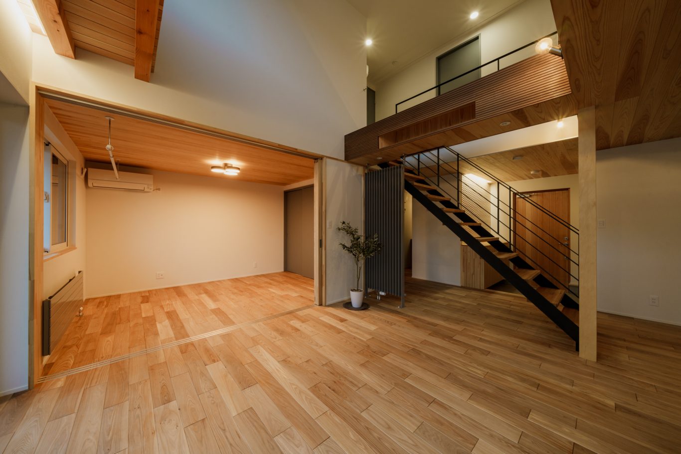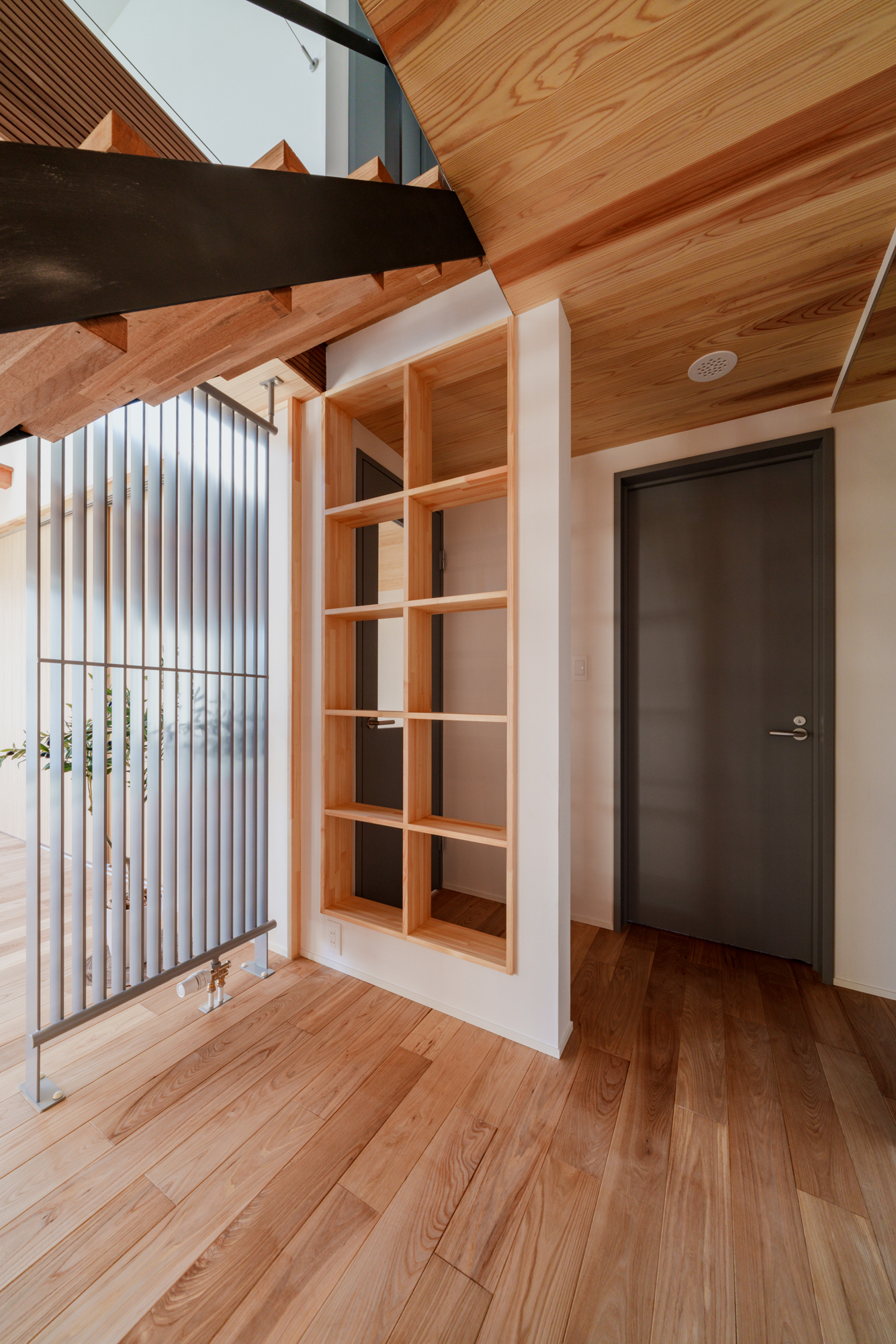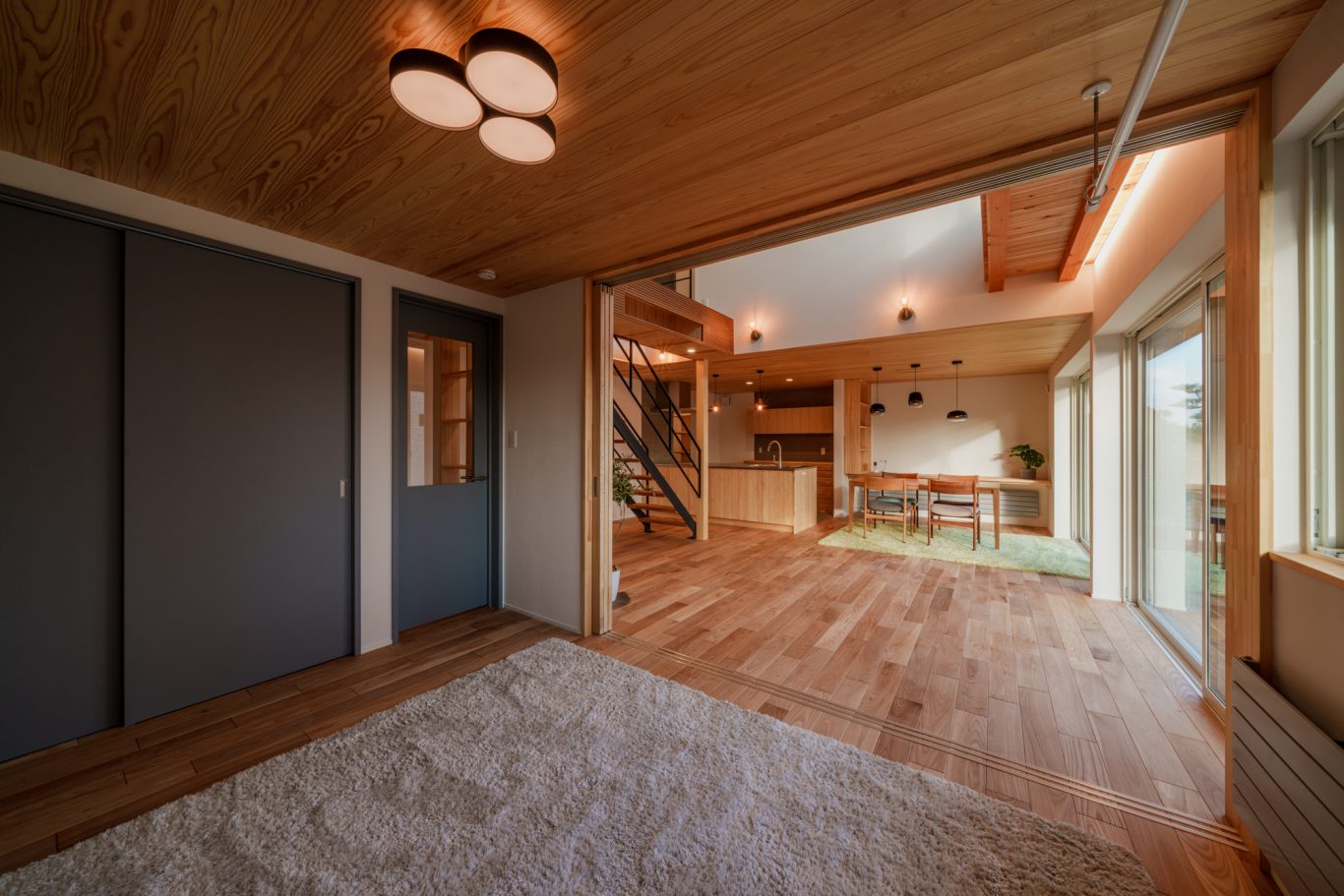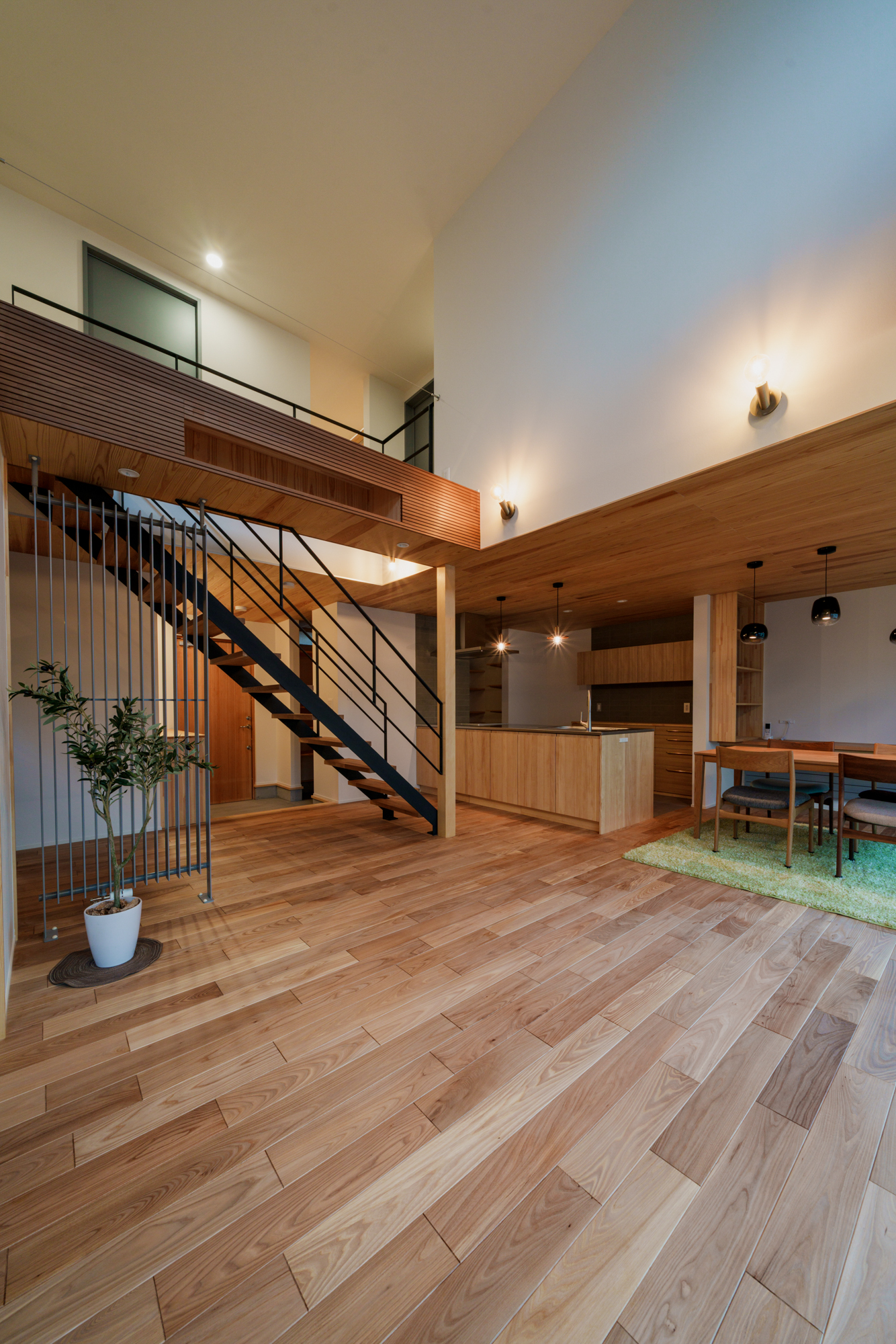 内装は入って正面の鉄骨階段から庭まで見通せる広々空間に、しっくい壁のホワイト、天井や無垢板のウッドにグレーの差し色が効いていて、まるでおしゃれなカフェのようです。