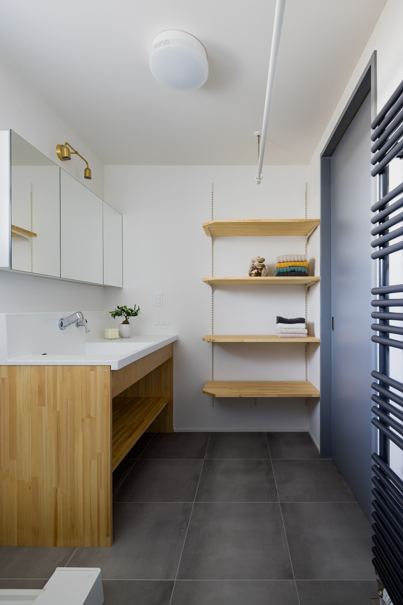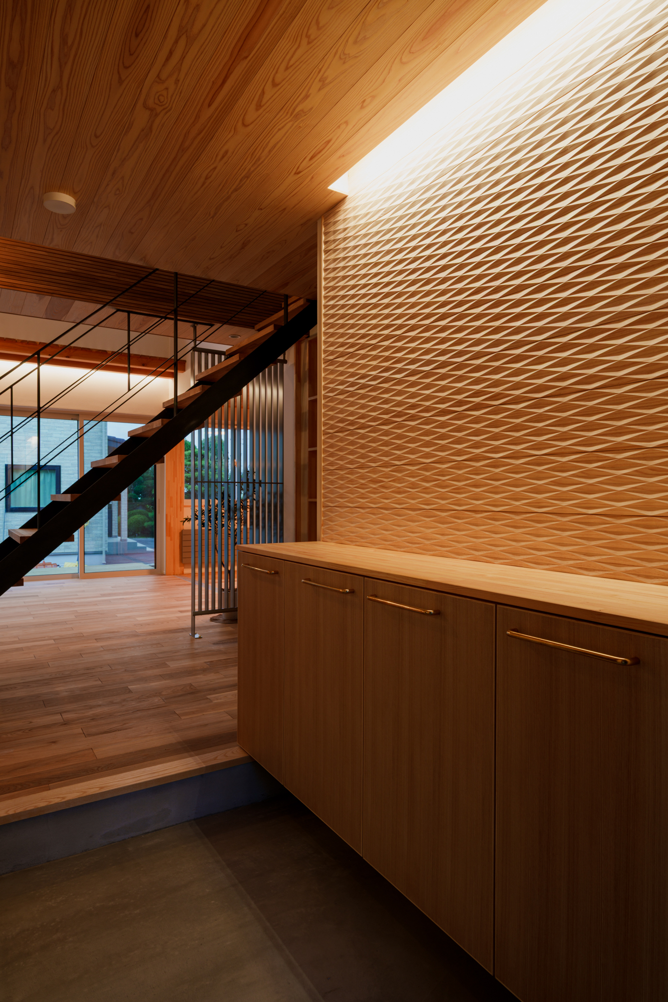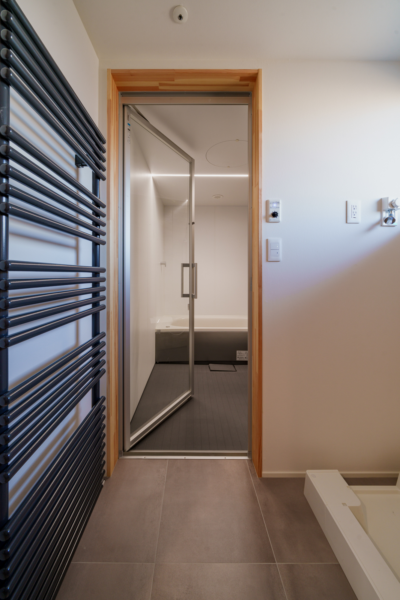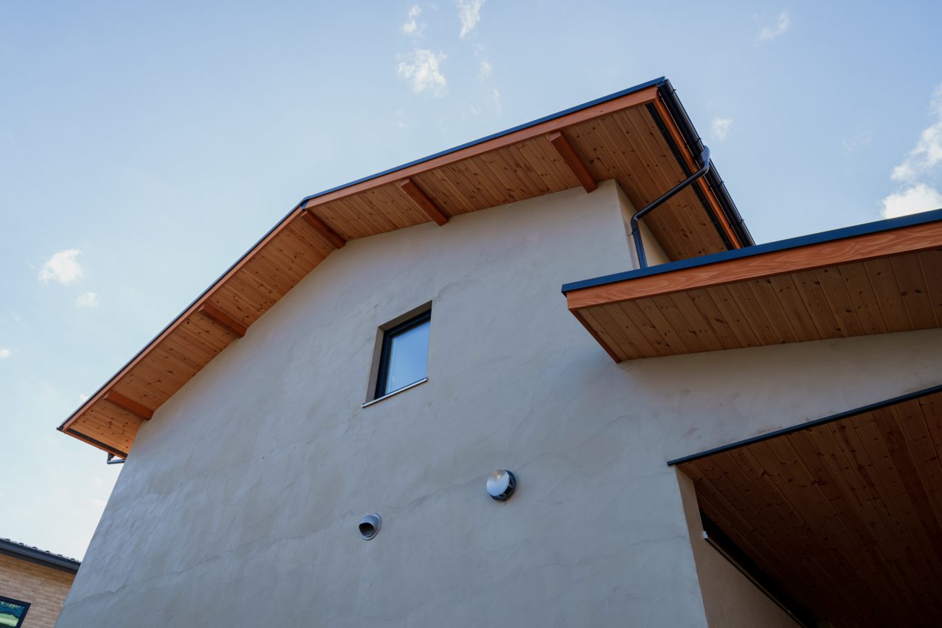 | 断熱 | Ua値:0.25 W/㎡K Q値:0.78 W/㎡K C値:0.4c㎡/㎡ 暖房負荷:16.5kWh/㎡ 外壁:HGW16K品 軸間105mm/外張り105mm KMブラケット 天井:吹込GW18Kニューダンブロー450mm 床:HGW16K品 245mm(根太間140mm+大引間105mm) 浴室・玄関 基礎内断熱:スタイロエースII 3種B 外100mm 内50mm 土間床50mm 樹脂サッシ:シャノンNS50 ガラス:ESクリアスーパー(アルゴンガス入りダブルLOW-E三層ガラス) 玄関ドア:ガデリウス スウェーデンドア Rebornオリジナル面材貼り =ベイツガ縦張り |