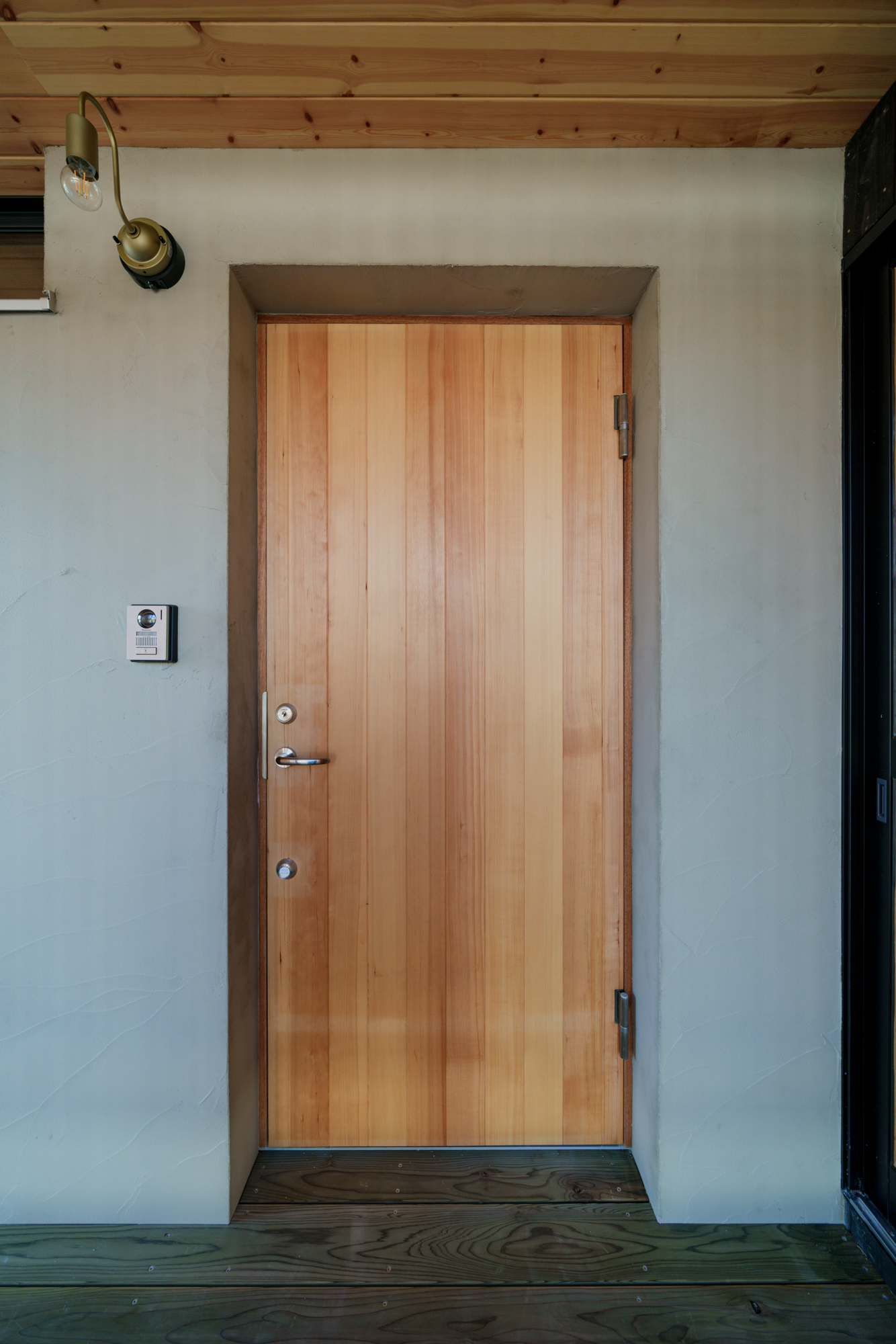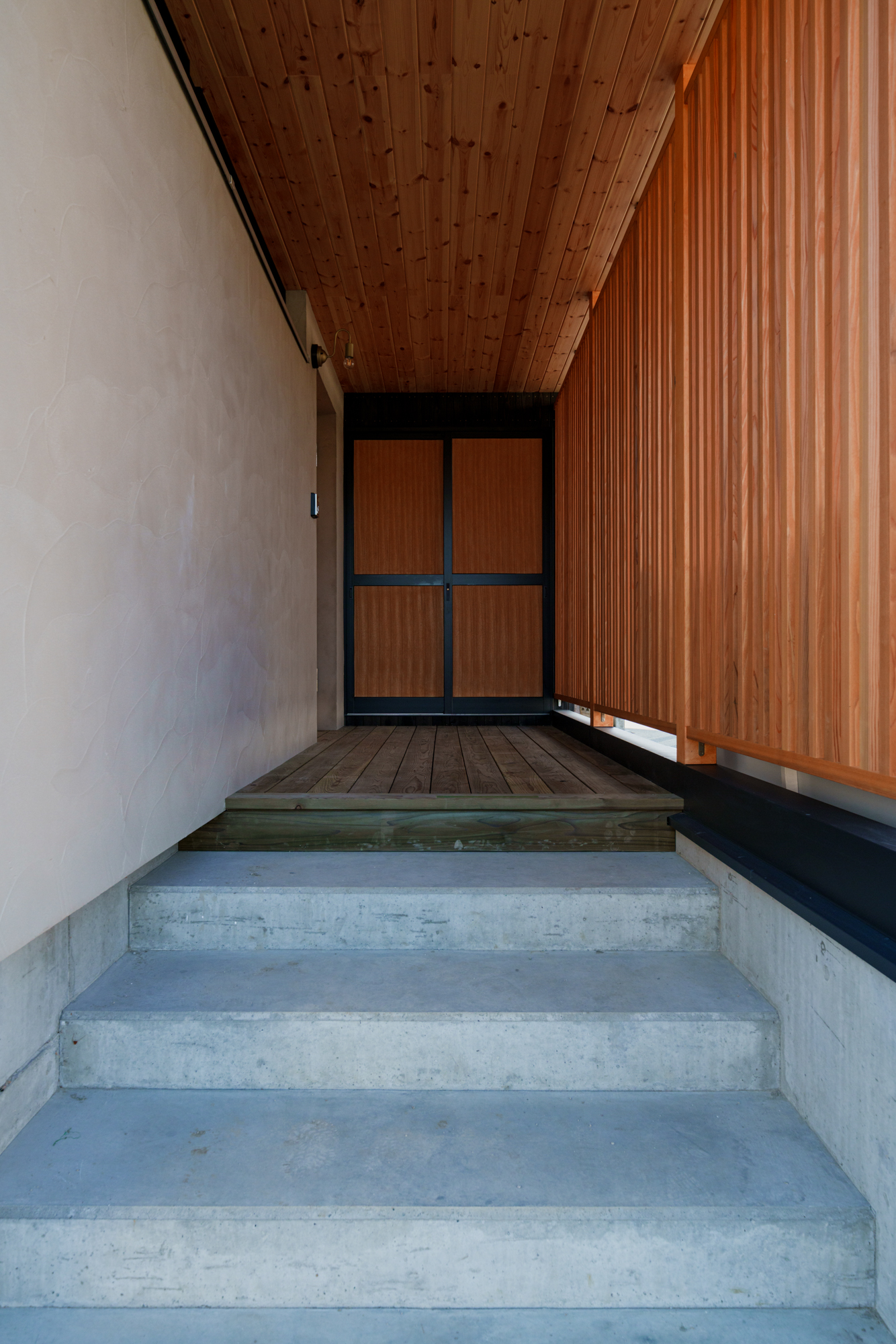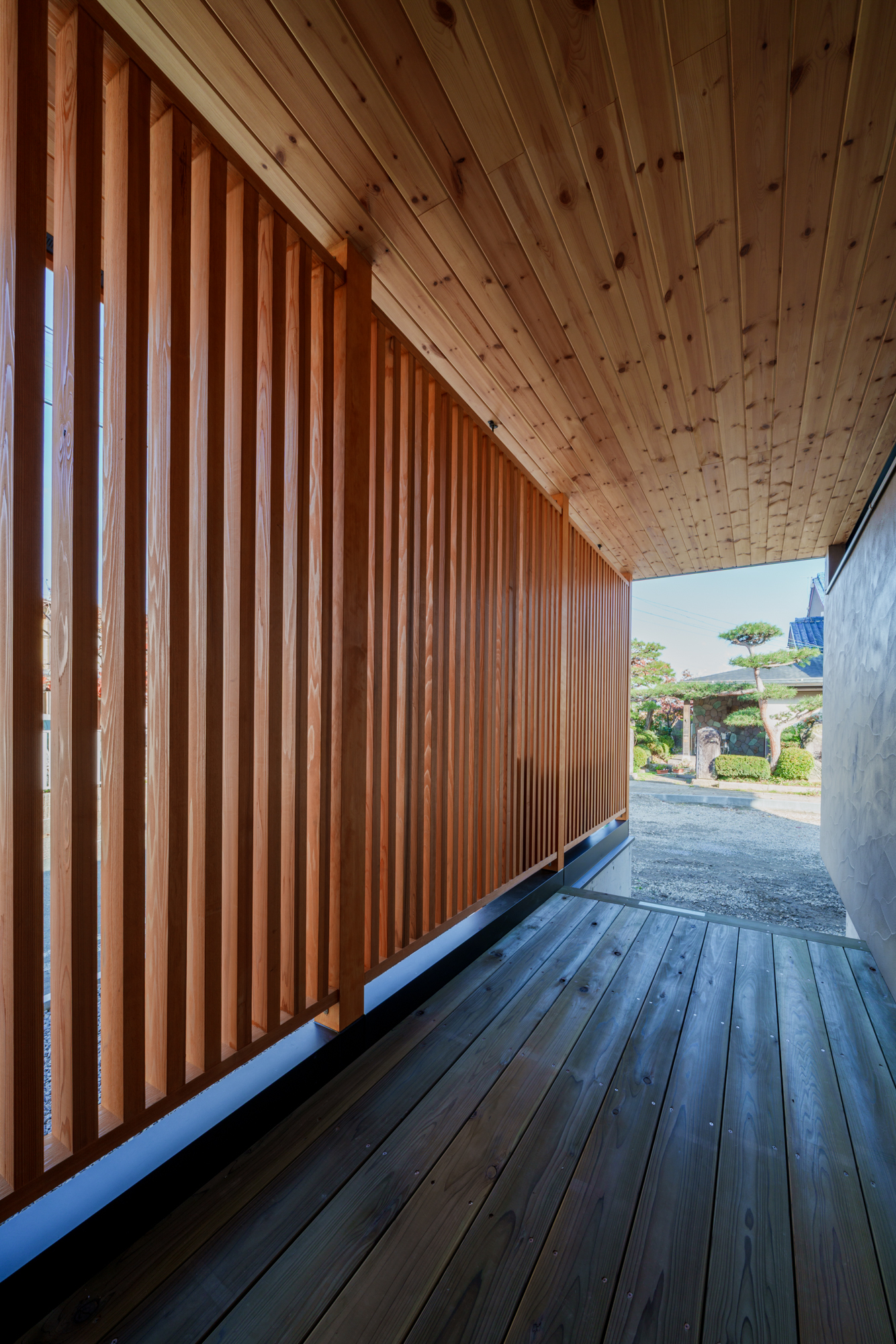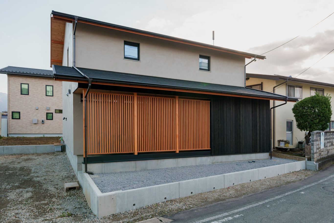道路側はブラックの杉板張り+木製の縦さんがパンチあり。